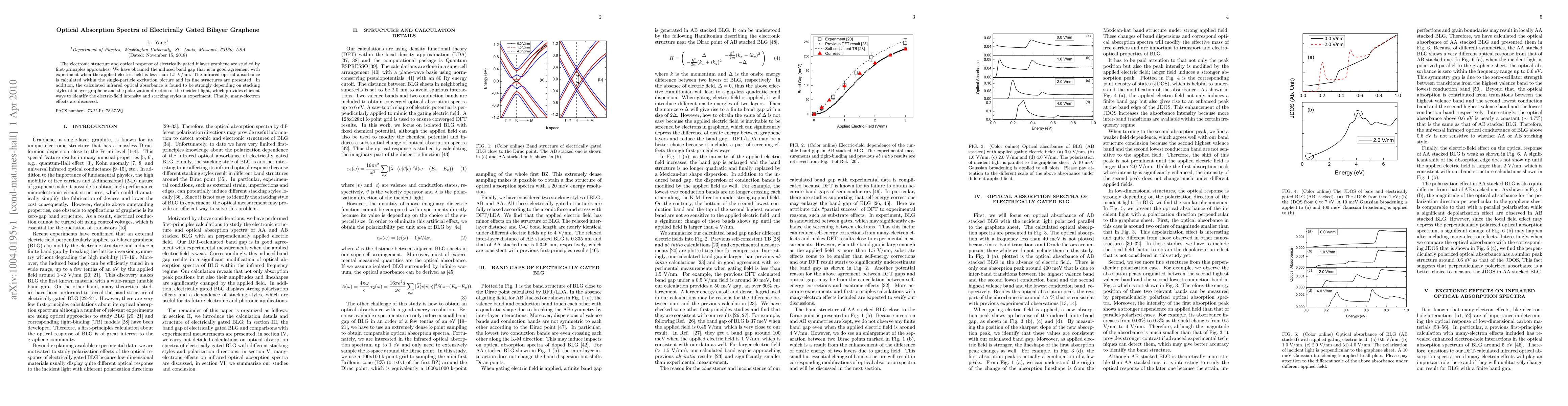 This study investigates the electronic structure and optical absorption of electrically gated bilayer graphene using first-principles methods, showing an induced band gap correlating well with experiments. The infrared optical absorbance is strongly dependent on the stacking configuration and polarization of incident light, offering practical methods for determining electric field intensity and stacking styles in experiments.