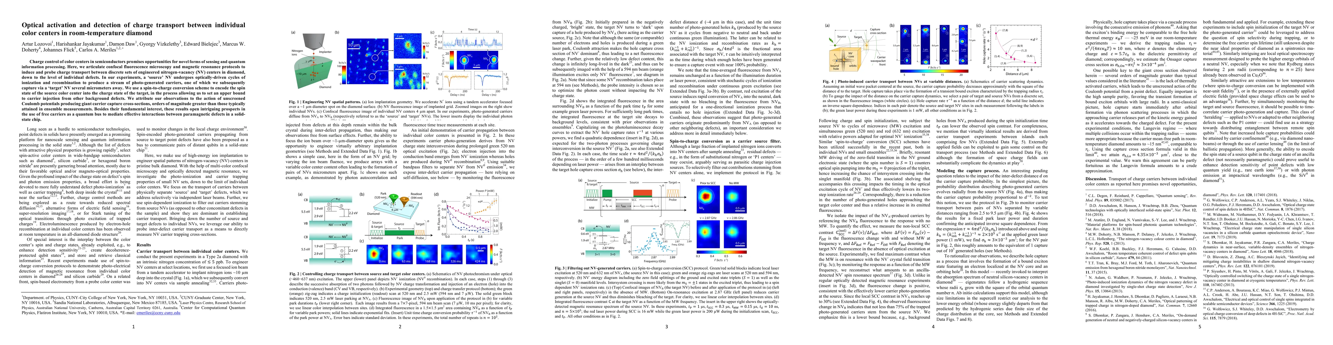 This research demonstrates the optical activation and detection of charge transport between individual color centers (NV centers) in diamond at room temperature. By using confocal fluorescence microscopy and magnetic resonance, scientists induce and probe charge transfer between discrete NV centers, even up to micrometers apart. They encode the spin state of a source color center into the charge state of a target NV, revealing high carrier capture cross-sections and suggesting potential applications in quantum information processing and solid-state chip-based interactions.