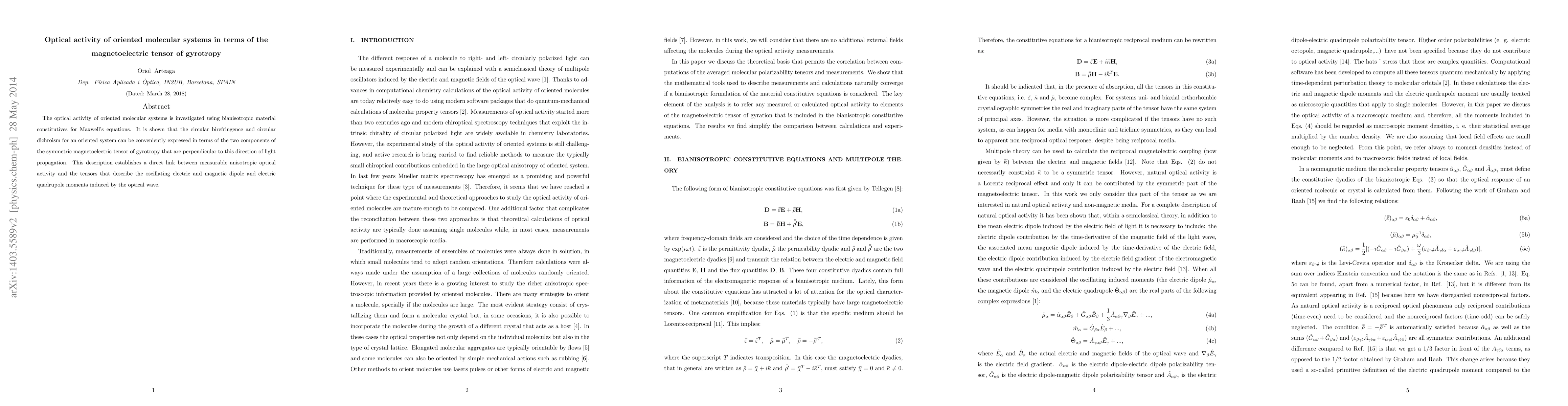 The optical activity of oriented molecular systems is investigated using bianisotropic material constitutives for Maxwell's equations. It is shown that the circular birefringence and circular dichroism in a given direction can be conveniently expressed in terms of the two components of the symmetric magnetoelectric tensor of gyrotropy that are perpendicular to this direction of light propagation. This description establishes a direct link between measurable anisotropic optical activity and the tensors that describe the oscillating electric and magnetic dipole and electric quadrupole moments induced by the optical wave.
