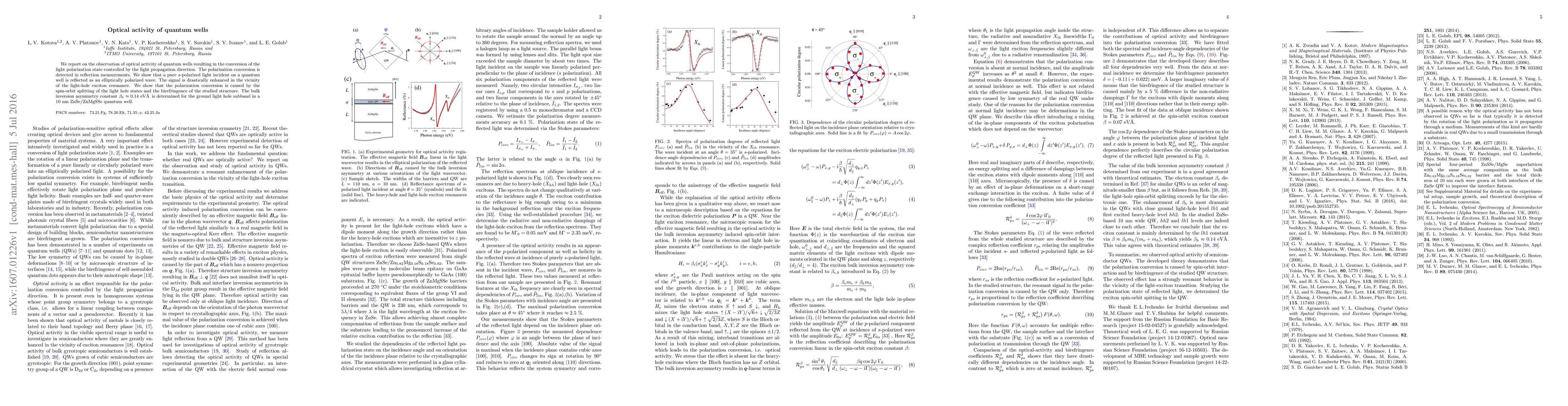 We report on the observation of optical activity of quantum wells resulting in the conversion of the light polarization state controlled by the light propagation direction. The polarization conversion is detected in reflection measurements. We show that a pure $s$-polarized light incident on a quantum well is reflected as an elliptically polarized wave. The signal is drastically enhanced in the vicinity of the light-hole exciton resonance. We show that the polarization conversion is caused by the spin-orbit splitting of the light hole states and the birefringence of the studied structure. The bulk inversion asymmetry constant $\beta_{h} \approx 0.14$ eV\AA, is determined for the ground light hole subband in a 10 nm ZnSe/ZnMgSSe quantum well.