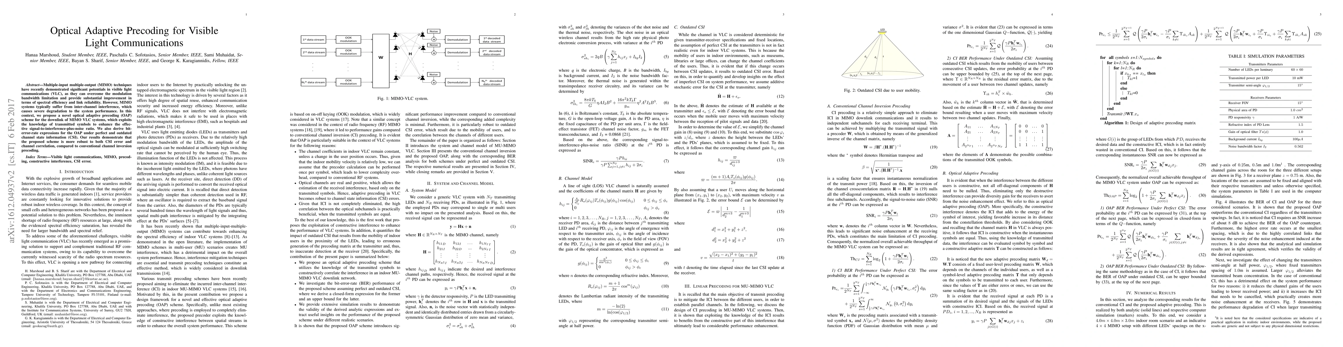 This paper proposes an optical adaptive precoding (OAP) scheme for MIMO visible light communications to enhance signal-to-interference-plus-noise ratio, addressing inter-channel interference. The results show that OAP outperforms conventional precoding in terms of robustness to channel state information errors and correlation.