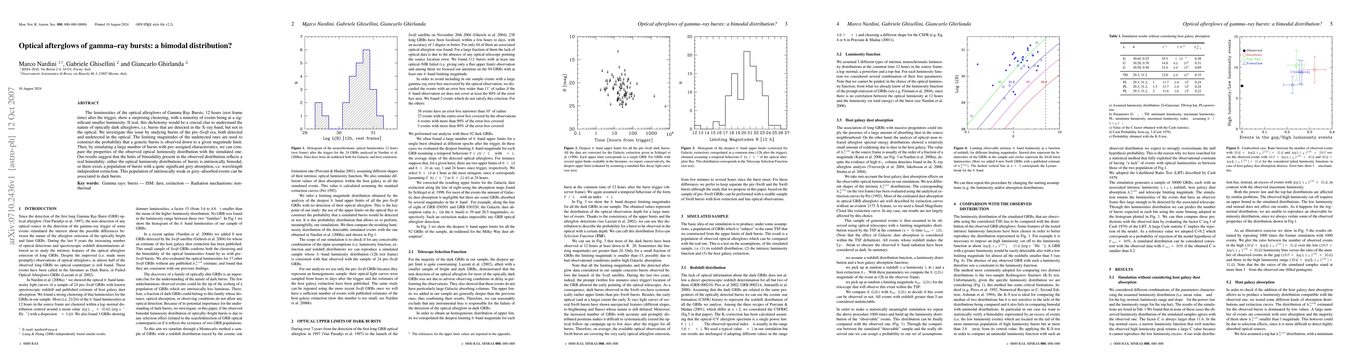 The luminosities of the optical afterglows of Gamma Ray Bursts, 12 hours (rest frame time) after the trigger, show a surprising clustering, with a minority of events being at a significant smaller luminosity. If real, this dichotomy would be a crucial clue to understand the nature of optically dark afterglows, i.e. bursts that are detected in the X-ray band, but not in the optical. We investigate this issue by studying bursts of the pre-Swift era, both detected and undetected in the optical. The limiting magnitudes of the undetected ones are used to construct the probability that a generic bursts is observed down to a given magnitude limit. Then, by simulating a large number of bursts with pre-assigned characteristics, we can compare the properties of the observed optical luminosity distribution with the simulated one. Our results suggest that the hints of bimodality present in the observed distribution reflects a real bimodality: either the optical luminosity distributions of bursts is intrinsically bimodal, or there exists a population of bursts with a quite significant grey absorption, i.e. wavelength independent extinction. This population of intrinsically weak or grey-absorbed events can be associated to dark bursts.