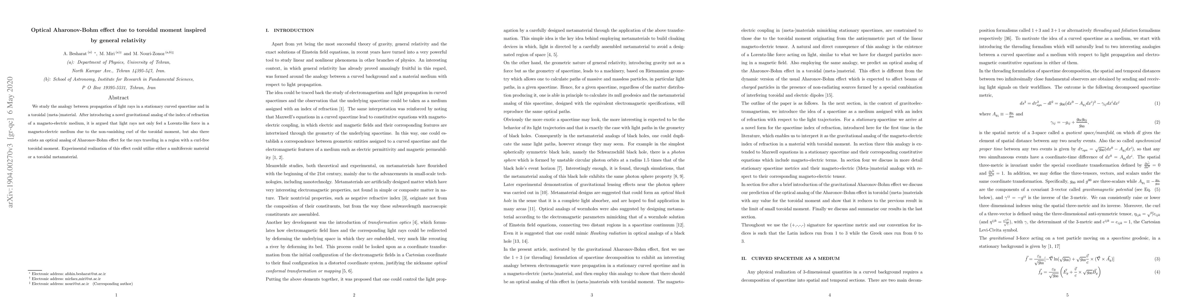 We study the analogy between propagation of light rays in a stationary curved spacetime and in a toroidal (meta-)material. After introducing a novel gravitational analog of the index of refraction of a magneto-electric medium, it is argued that light rays not only feel a Lorentz-like force in a magneto-electric medium due to the non-vanishing curl of the toroidal moment, but also there exists an optical analog of Aharonov-Bohm effect for the rays traveling in a region with a curl-free toroidal moment. Experimental realization of this effect could utilize either a multiferroic material or a toroidal metamaterial.