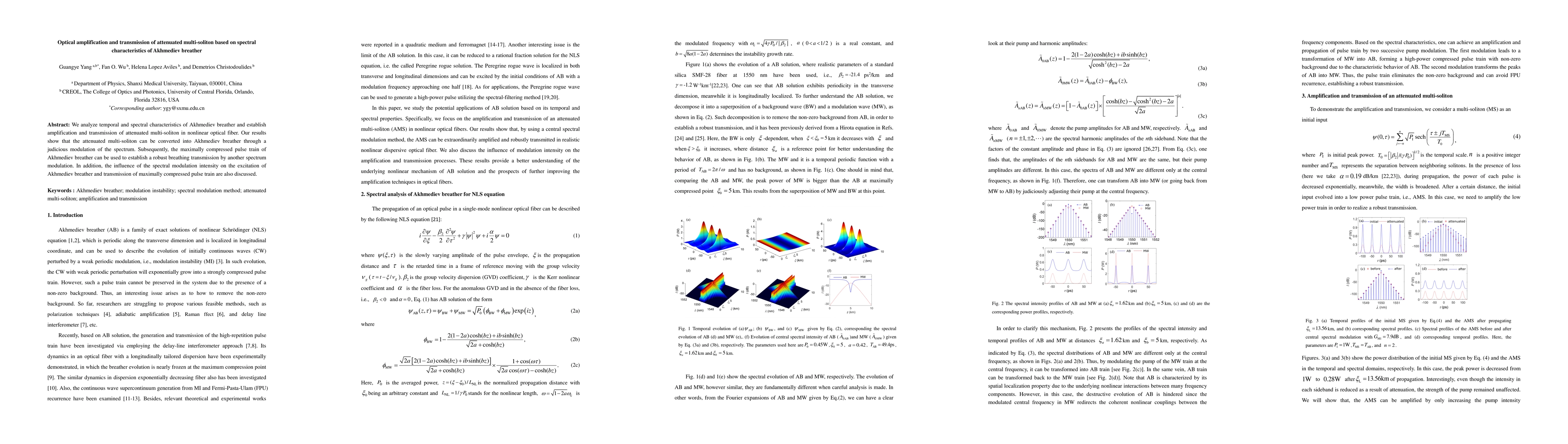 This paper investigates the temporal and spectral characteristics of Akhmediev breather to amplify and transmit attenuated multi-soliton in nonlinear optical fibers. It demonstrates the conversion of multi-soliton into Akhmediev breather via spectral modulation, followed by a robust transmission using a compressed pulse train, while discussing the impact of modulation intensity.