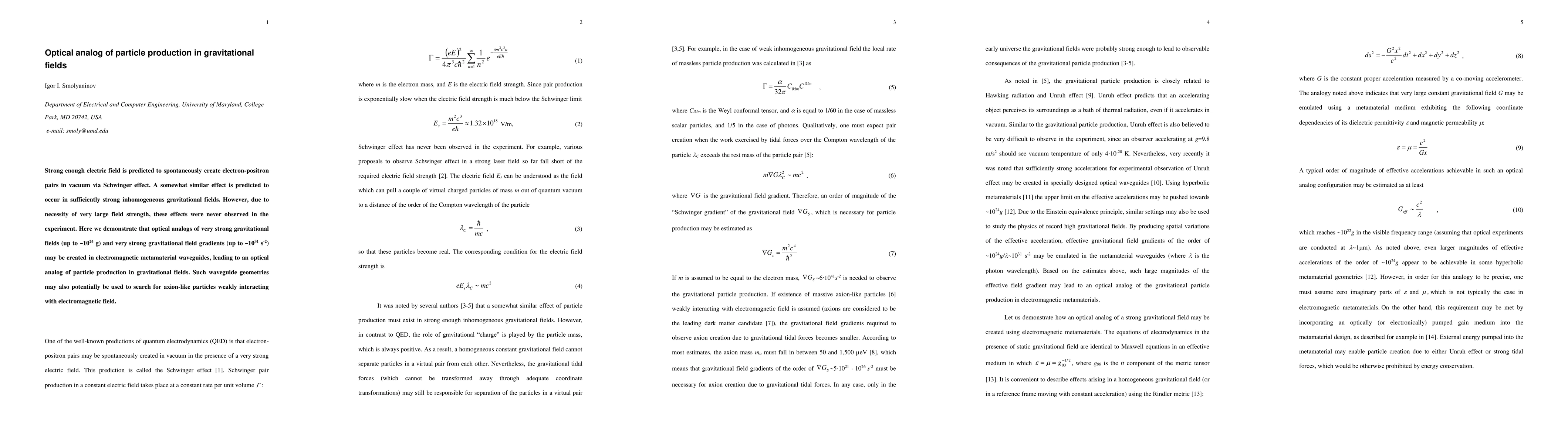 This paper demonstrates the creation of optical analogs of strong gravitational fields in electromagnetic metamaterial waveguides, mimicking particle production effects similar to the Schwinger effect in electric fields. These analogs may also serve to search for axion-like particles.