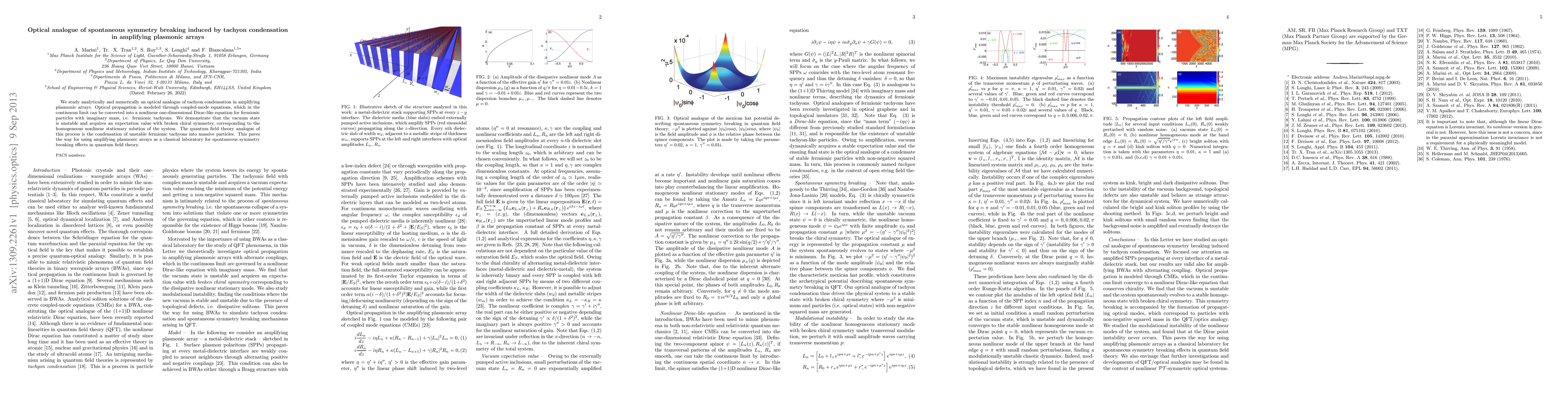 We study analytically and numerically an optical analogue of tachyon condensation in amplifying plasmonic arrays. Optical propagation is modeled through coupled-mode equations, which in the continuous limit can be converted into a nonlinear one-dimensional Dirac-like equation for fermionic particles with imaginary mass, i.e. fermionic tachyons. We demonstrate that the vacuum state is unstable and acquires an expectation value with broken chiral symmetry, corresponding to the homogeneous nonlinear stationary solution of the system. The quantum field theory analogue of this process is the condensation of unstable fermionic tachyons into massive particles. This paves the way for using amplifying plasmonic arrays as a classical laboratory for spontaneous symmetry breaking effects in quantum field theory.