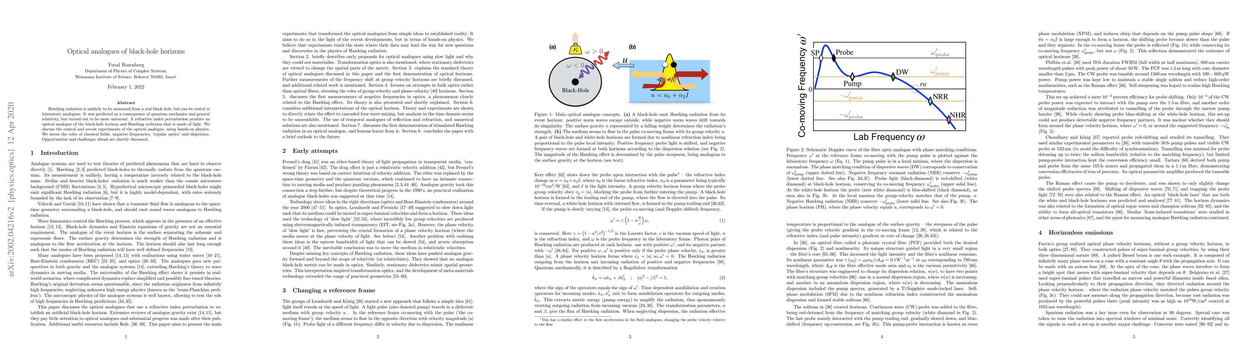 Hawking radiation is unlikely to be measured from a real black-hole, but can be tested in laboratory analogues. It was predicted as a consequence of quantum mechanics and general relativity, but turned out to be more universal. A refractive index perturbation produce an optical analogue of the black-hole horizon and Hawking radiation that is made of light. We discuss the central and recent experiments of the optical analogue, using hands-on physics. We stress the roles of classical fields, negative frequencies, 'regular optics' and dispersion. Opportunities and challenges ahead are shortly discussed.