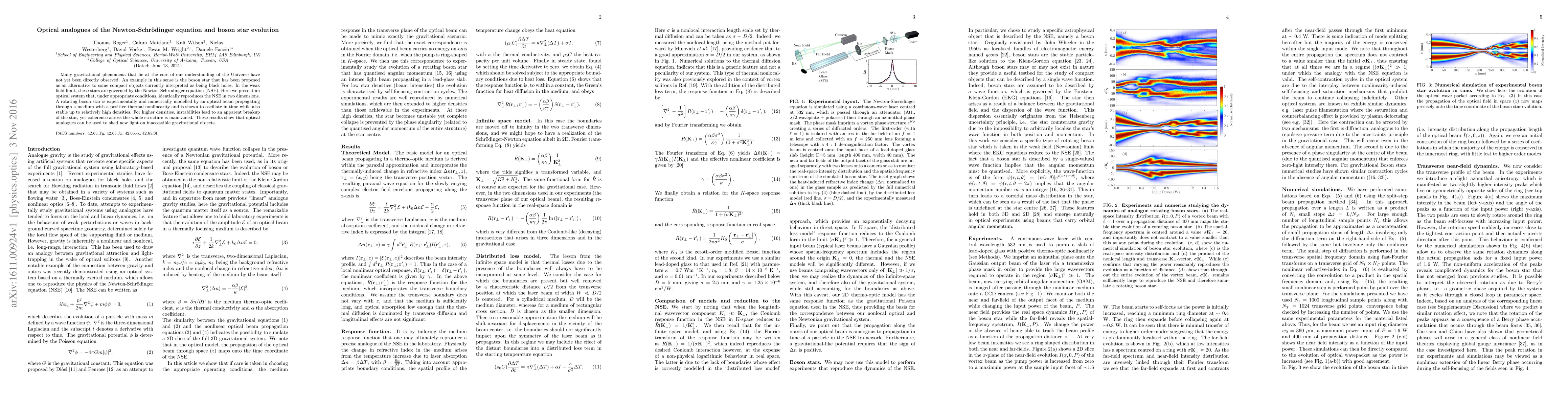 Many gravitational phenomena that lie at the core of our understanding of the Universe have not yet been directly observed. An example in this sense is the boson star that has been proposed as an alternative to some compact objects currently interpreted as being black holes. In the weak field limit, these stars are governed by the Newton-Schrodinger equation (NSE). Here we present an optical system that, under appropriate conditions, identically reproduces the NSE in two dimensions. A rotating boson star is experimentally and numerically modelled by an optical beam propagating through a medium with a positive thermal nonlinearity and is shown to oscillate in time while also stable up to relatively high densities. For higher densities, instabilities lead to an apparent breakup of the star, yet coherence across the whole structure is maintained. These results show that optical analogues can be used to shed new light on inaccessible gravitational objects.