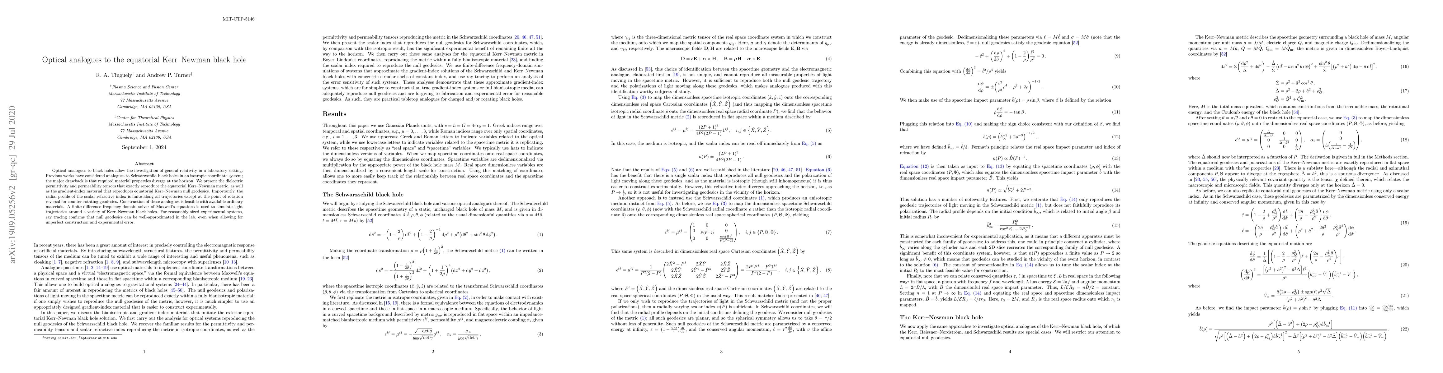 Optical analogues to black holes allow the investigation of general relativity in a laboratory setting. Previous works have considered analogues to Schwarzschild black holes in an isotropic coordinate system; the major drawback is that required material properties diverge at the horizon. We present the dielectric permittivity and permeability tensors that exactly reproduce the equatorial Kerr-Newman metric, as well as the gradient-index material that reproduces equatorial Kerr-Newman null geodesics. Importantly, the radial profile of the scalar refractive index is finite along all trajectories except at the point of rotation reversal for counter-rotating geodesics. Construction of these analogues is feasible with available ordinary materials. A finite-difference frequency-domain solver of Maxwell's equations is used to simulate light trajectories around a variety of Kerr-Newman black holes. For reasonably sized experimental systems, ray tracing confirms that null geodesics can be well-approximated in the lab, even when allowing for imperfect construction and experimental error.
