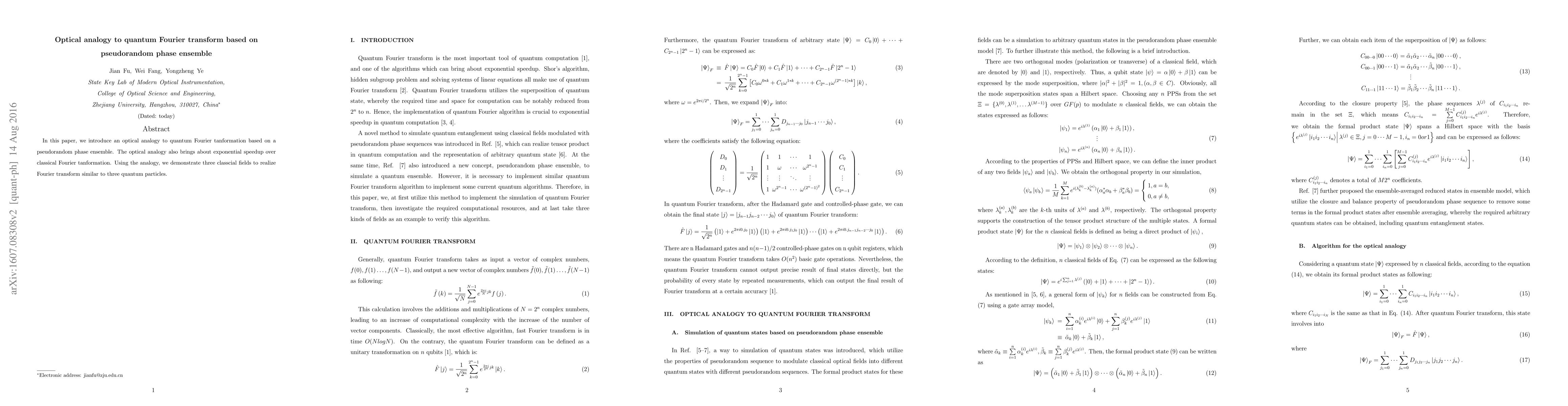 Summary: This paper presents an optical analogy to the quantum Fourier transform using a pseudorandom phase ensemble, achieving exponential speedup over classical Fourier transforms. It demonstrates the realization of Fourier transform through three classical fields analogous to three quantum particles.