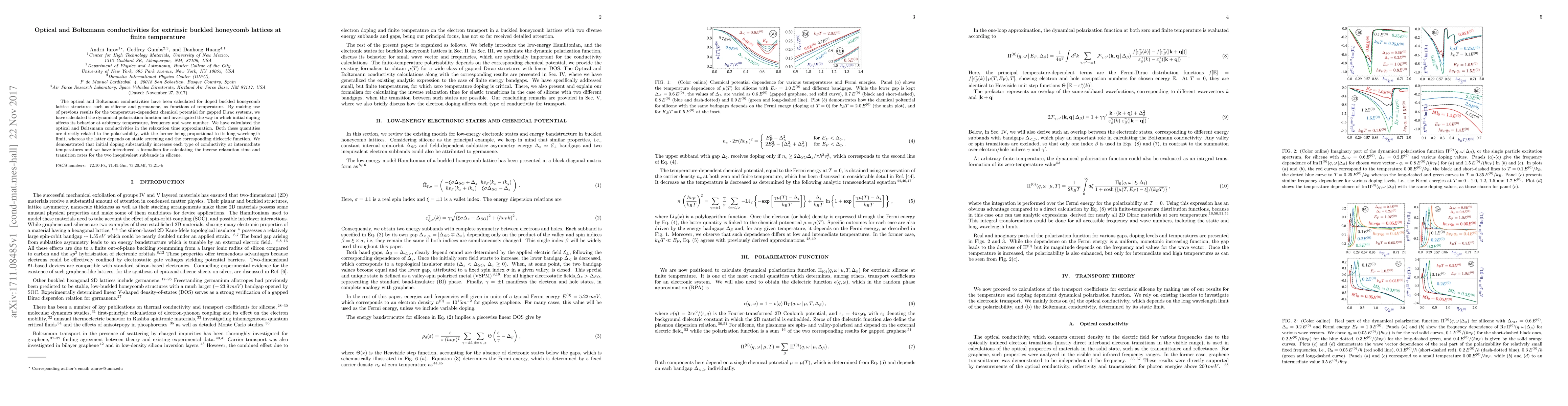 This paper calculates optical and Boltzmann conductivities for doped buckled honeycomb lattices, like silicene and germanene, at finite temperatures. It shows that initial doping significantly enhances these conductivities at intermediate temperatures, introducing a formalism for calculating relaxation times and transition rates for silicene's subbands.