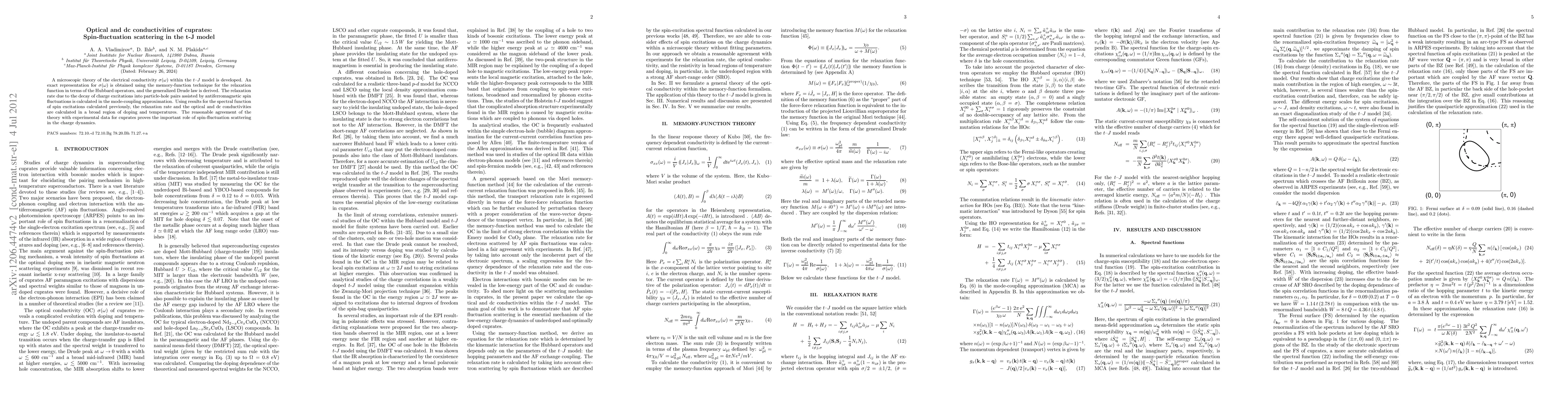 A microscopic theory of the electrical conductivity $\sigma(\omega)$ within the t-J model is developed. An exact representation for $\sigma(\omega)$ is obtained using the memory-function technique for the relaxation function in terms of the Hubbard operators, and the generalized Drude law is derived. The relaxation rate due to the decay of charge excitations into particle-hole pairs assisted by antiferromagnetic spin fluctuations is calculated in the mode-coupling approximation. Using results for the spectral function of spin excitations calculated previously, the relaxation rate and the optical and dc conductivities are calculated in a broad region of doping and temperatures. The reasonable agreement of the theory with experimental data for cuprates proves the important role of spin-fluctuation scattering in the charge dynamics.