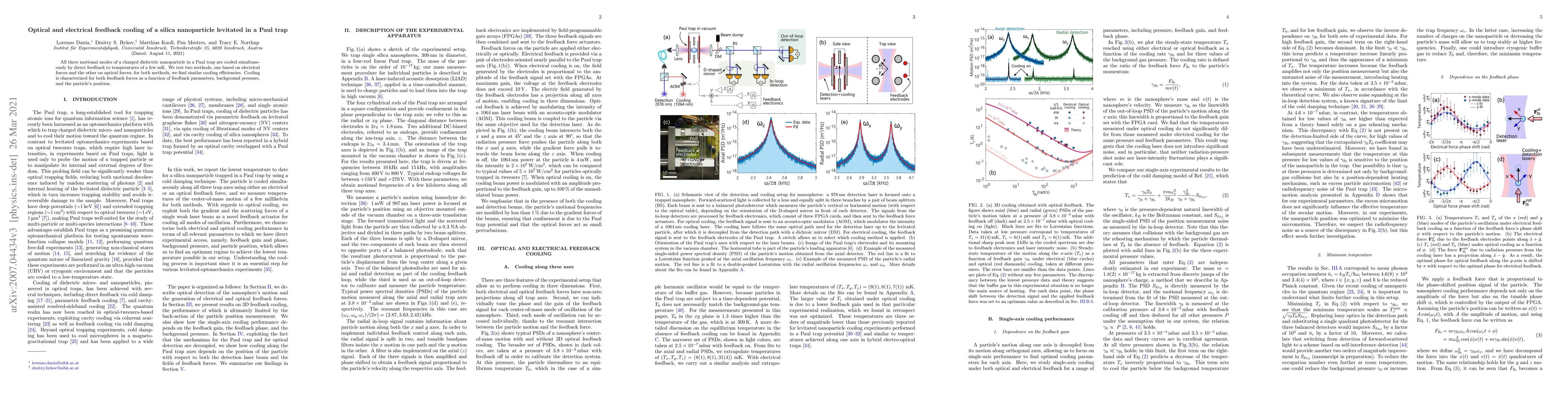 The research utilized optical and electrical feedback cooling methods to achieve cooling of a silica nanoparticle levitated in a Paul trap, demonstrating similar cooling efficiencies for both methods. The cooling performance was characterized as a function of feedback parameters, background pressure, and the particle's position.