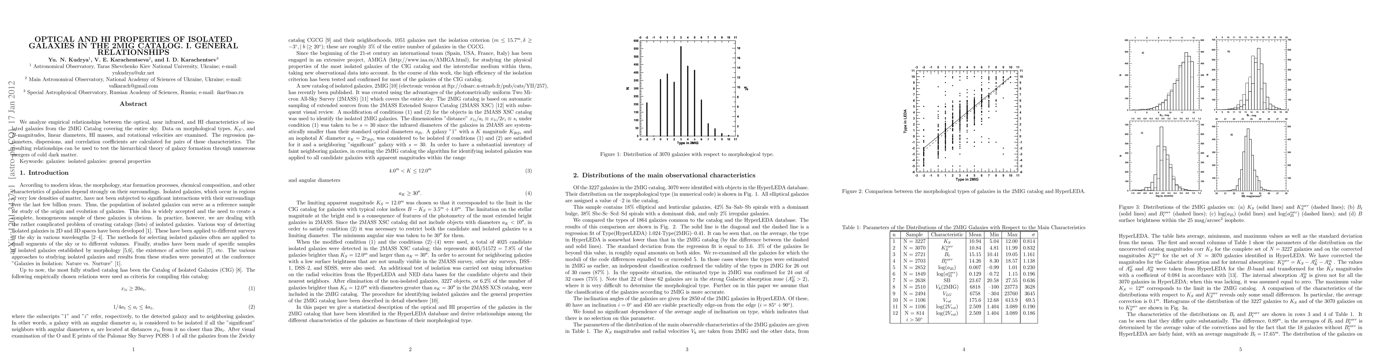 We analyze empirical relationships between the optical, near infrared, and HI characteristics of isolated galaxies from the 2MIG Catalog covering the entire sky. Data on morphological types, K_S-, and B-magnitudes, linear diameters, HI masses, and rotational velocities are examined. The regression parameters, dispersions, and correlation coefficients are calculated for pairs of these characteristics. The resulting relationships can be used to test the hierarchical theory of galaxy formation through numerous mergers of cold dark matter.
