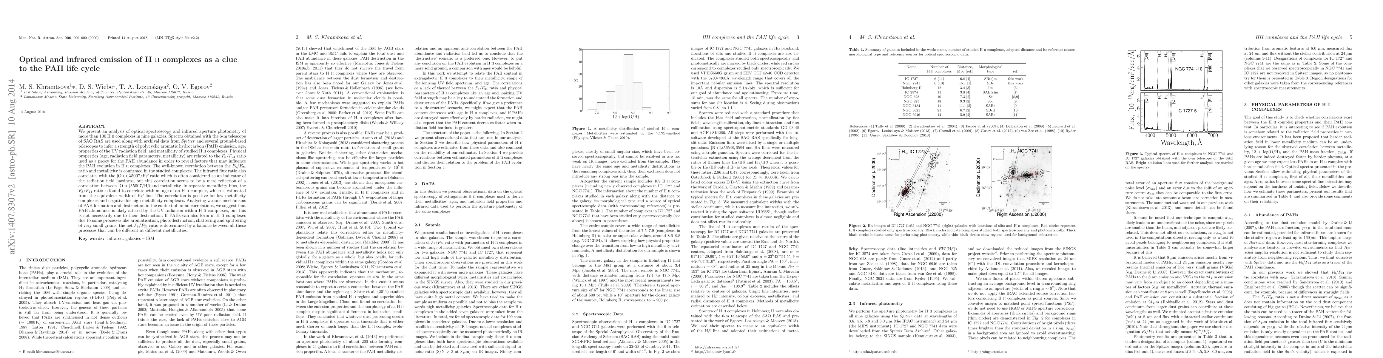 We present an analysis of optical spectroscopy and infrared aperture photometry of more than 100 H II complexes in nine galaxies. Spectra obtained with the 6-m telescope of SAO RAS are used along with archival data from Spitzer and several ground-based telescopes to infer a strength of polycyclic aromatic hydrocarbon (PAH) emission, age, properties of the UV radiation field, and metallicity of studied H II complexes. Physical properties (age, radiation field parameters, metallicity) are related to the $F_{8}/F_{24}$ ratio used as a proxy for the PAH abundance in order to reveal factors that may influence the PAH evolution in H II complexes. The well-known correlation between the $F_{8}/F_{24}$ ratio and metallicity is confirmed in the studied complexes. The infrared flux ratio also correlates with the [O III]$\lambda 5007/\mathrm{H\beta}$ ratio which is often considered as an indicator of the radiation field hardness, but this correlation seems to be a mere reflection of a correlation between [O III]$\lambda 5007/\mathrm{H\beta}$ and metallicity. In separate metallicity bins, the $F_{8}/F_{24}$ ratio is found to correlate with an age of an H II complex, which is estimated from the equivalent width of $\mathrm{H}\beta$ line. The correlation is positive for low metallicity complexes and negative for high metallicity complexes. Analysing various mechanisms of PAH formation and destruction in the context of found correlations, we suggest that PAH abundance is likely altered by the UV radiation within H II complexes, but this is not necessarily due to their destruction. If PAHs can also form in H II complexes due to some processes like aromatisation, photodestruction, shattering and sputtering of very small grains, the net $F_{8}/F_{24}$ ratio is determined by a balance between all these processes that can be different at different metallicities.