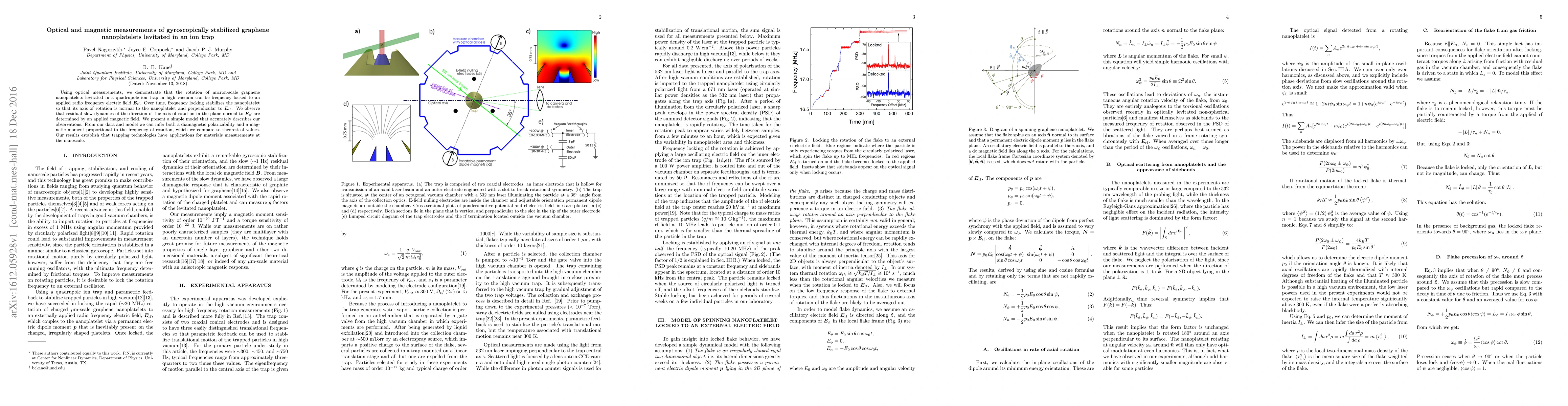 This paper demonstrates the stabilization of rotating graphene nanoplatelets in an ion trap using optical measurements, showing that their rotation axis aligns perpendicular to an applied radio frequency electric field. The study also reveals that residual rotational dynamics are influenced by an external magnetic field, providing insights into the material's diamagnetic polarizability and magnetic moment.