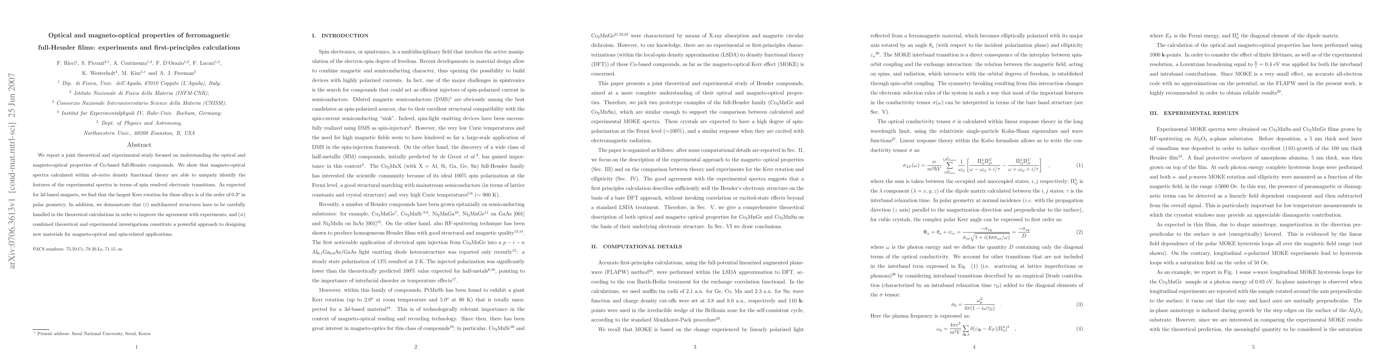 This study combines theoretical and experimental methods to investigate the optical and magneto-optical properties of Co-based full-Heusler films, finding strong Kerr rotation effects and emphasizing the necessity of precise theoretical modeling for multilayered structures. The synergy between theory and experiment enhances the design of new materials for advanced magneto-optical applications.