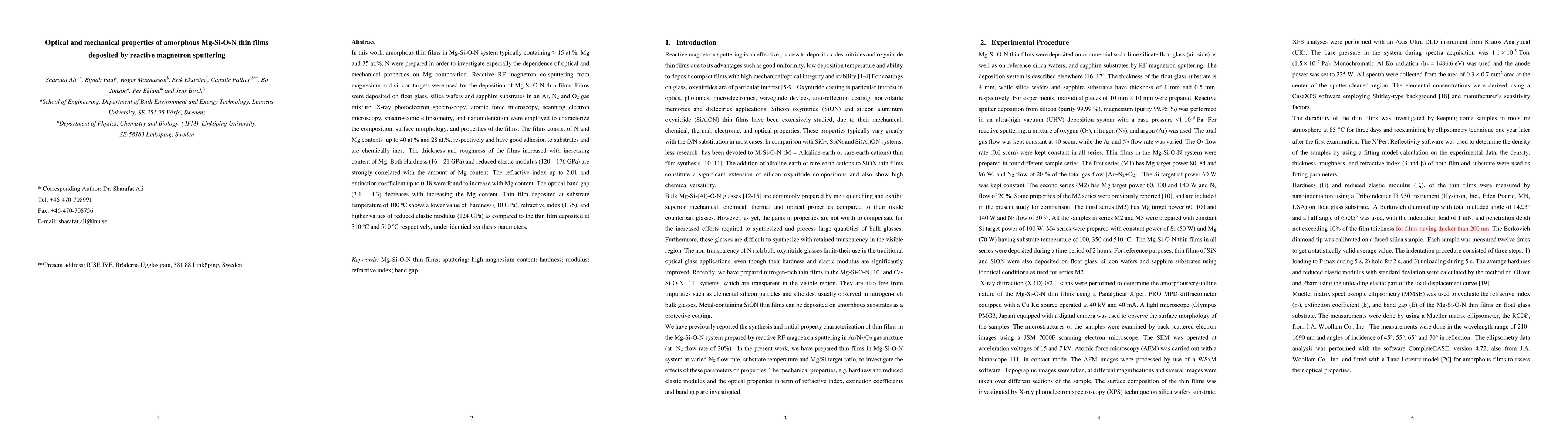This study investigates the optical and mechanical properties of amorphous Mg-Si-O-N thin films deposited by reactive magnetron sputtering, revealing how magnesium composition influences these properties through comprehensive characterization using various analytical techniques.