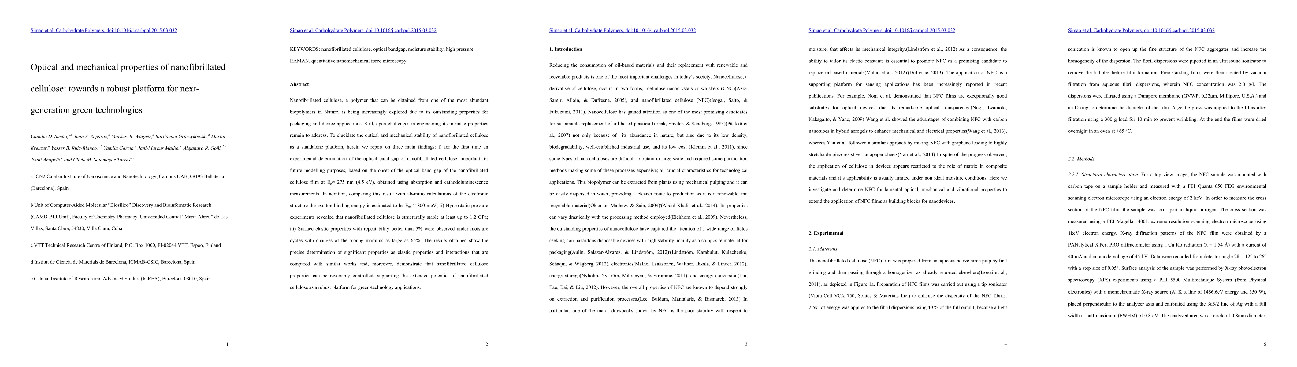 This paper investigates the optical and mechanical properties of nanofibrillated cellulose, revealing its elastic characteristics and interactions, and demonstrates that its properties can be reversibly controlled, highlighting its potential as a sustainable material for next-generation green technologies.
