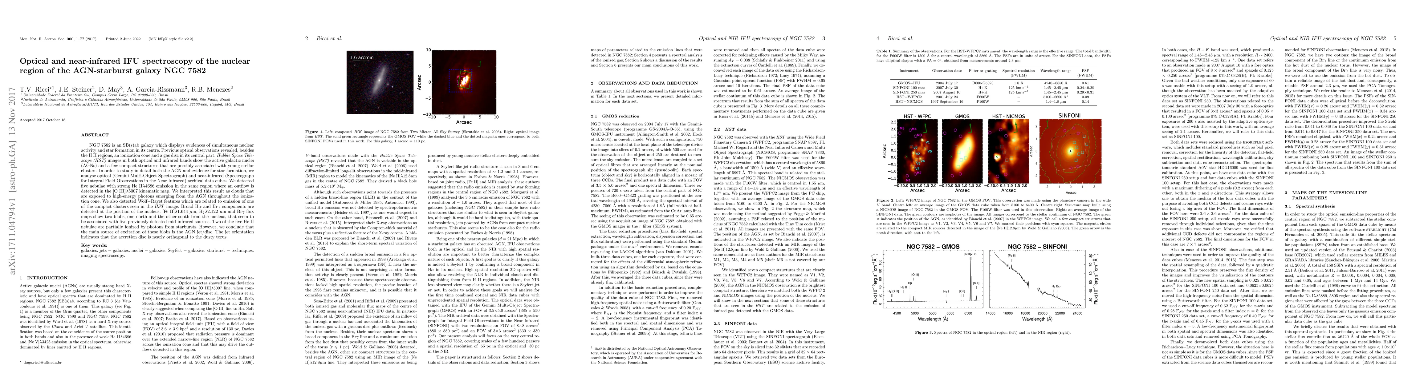 The study of NGC 7582, an active galaxy with simultaneous nuclear activity and star formation, reveals five He II nebulae ionized by an AGN jet/disc, as supported by broad Hu00b9u03b1 and Bru03b3 components at the nucleus and [Fe II] and H2 flux maps showing blobs associated with mid-infrared sources. HST images confirm young stellar clusters, with Wolf-Rayet features linked to one cluster's emission.