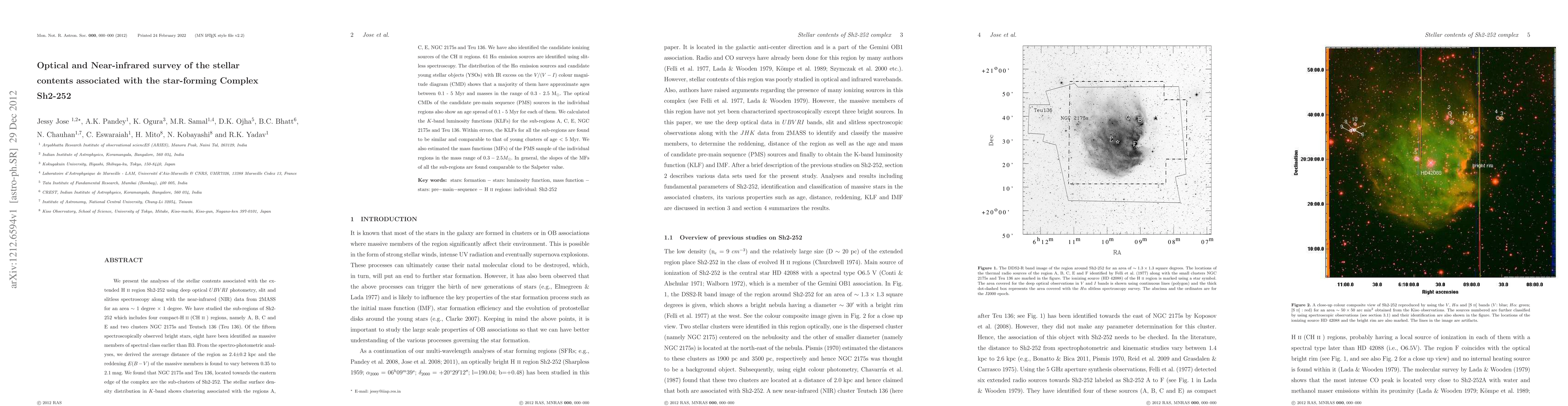 We present the analyses of the stellar contents associated with the HII region Sh2-252 using UBVRI photometry, slit and slitless spectroscopy along with the NIR data from 2MASS for an area ~1 degree x 1 degree. We studied the sub-regions of Sh2-252 which includes four compact-HII (CHII) regions, namely A, B, C and E and two clusters NGC 2175s and Teutsch 136 (Teu 136). Of the fifteen spectroscopically observed bright stars, eight have been identified as massive members of spectral class earlier than B3. From the spectro-photometric analyses, we derived the average distance of the region as 2.4+/-0.2 kpc and the reddening of the massive members is found to vary between 0.35 to 2.1 mag. We found that NGC 2175s and Teu 136, located towards the eastern edge of the complex are the sub-clusters of Sh2-252. The stellar surface density distribution in K-band shows clustering associated with the regions A, C, E, NGC 2175s and Teu 136. We have also identified the candidate ionizing sources of the CHII regions. 61 H_alpha emission sources are identified using slitless spectroscopy. The distribution of the H_alpha emission sources and candidate YSOs with IR excess on the V/(V-I) CMD shows that a majority of them have approximate ages between 0.1 - 5 Myr and masses in the range of 0.3 - 2.5 M_sun. The CMDs of the candidate YSOs in the individual regions also show an age spread of 0.1 - 5 Myr for each of them. We calculated the KLFs for the sub-regions A, C, E, NGC 2175s and Teu 136. Within errors, the KLFs for all the sub-regions are found to be similar and comparable to that of young clusters of age < 5 Myr. We also estimated the mass functions (MFs) of the PMS sample of the individual regions in the mass range of 0.3 - 2.5 M_sun. In general, the slopes of the MFs of all the sub-regions are found comparable to the Salpeter value.