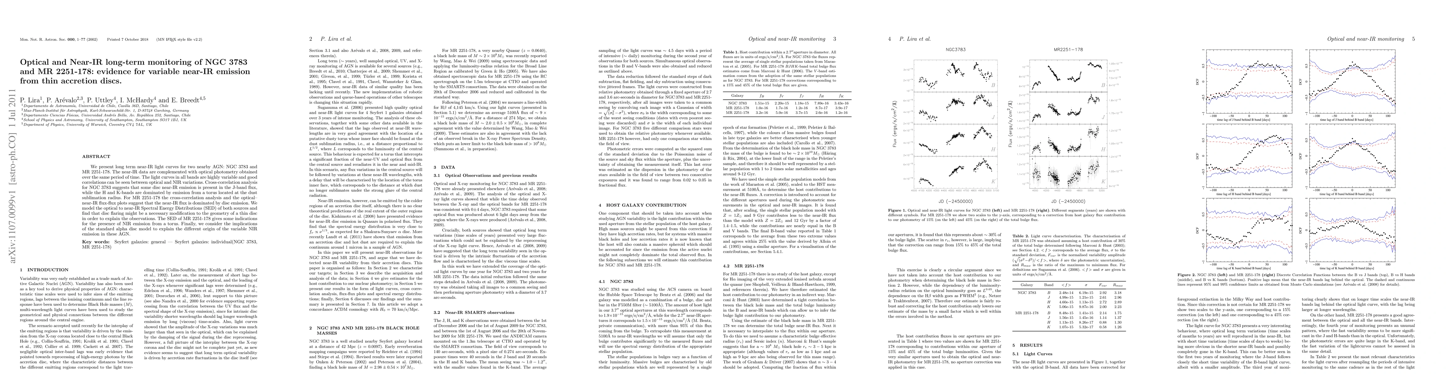 We present long term near-IR light curves for two nearby AGN: NGC3783 and MR2251-178. The near-IR data are complemented with optical photometry obtained over the same period of time. The light curves in all bands are highly variable and good correlations can be seen between optical and NIR variations. Cross-correlation analysis for NGC 3783 suggests that some disc near-IR emission is present in the J-band flux, while the H and K-bands are dominated by emission from a torus located at the dust sublimation radius. For MR2251-178 the cross-correlation analysis and the optical-near-IR flux-flux plots suggest that the near-IR flux is dominated by disc emission. We model the optical to near-IR Spectral Energy Distributions (SED) of both sources and find that disc flaring might be a necessary modification to the geometry of a thin disc in order to explain the observations. The SED of MR2251-178 gives some indications for the presence of NIR emission from a torus. Finally, we consider the implications of the standard alpha disc model to explain the different origin of the variable NIR emission in these AGN.