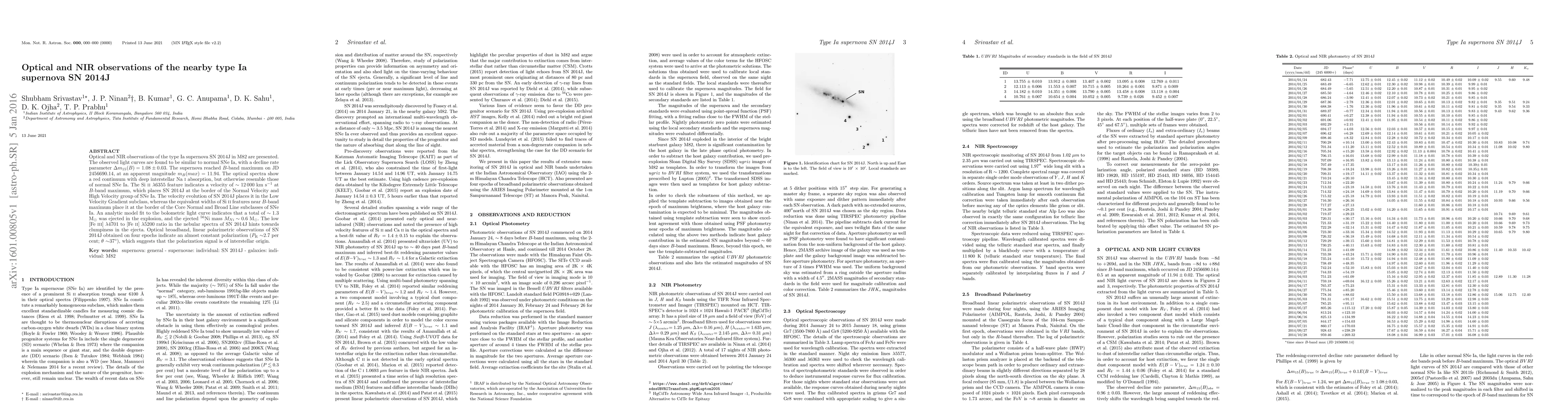 This paper presents optical and NIR observations of SN 2014J, a type Ia supernova in M82, showing light curves similar to normal SNe Ia with a decline rate of $\Delta m_{15}(B) = 1.08 \pm 0.03$. The supernova's spectra and velocity evolution suggest it straddles several subclasses of SNe Ia, indicating a total ejected mass of $\sim 1.3$ M$_{\odot}$ and a $^{56}$Ni mass of $\sim 0.6$ M$_{\odot}$.