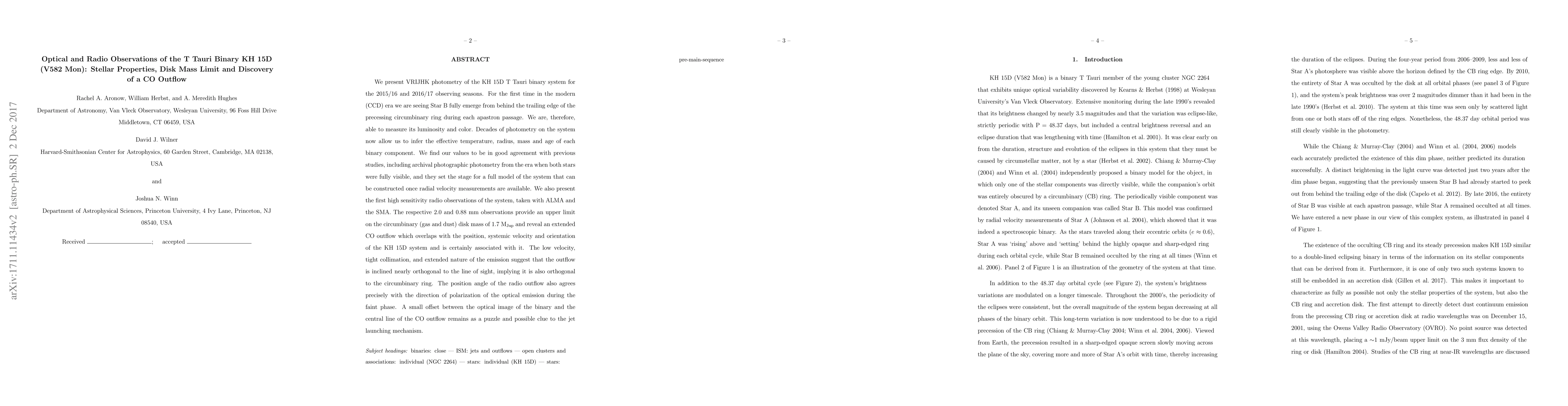 We present VRIJHK photometry of the KH 15D T Tauri binary system for the 2015/16 and 2016/17 observing seasons. For the first time in the modern (CCD) era we are seeing Star B fully emerge from behind the trailing edge of the precessing circumbinary ring during each apastron passage. We are, therefore, able to measure its luminosity and color. Decades of photometry on the system now allow us to infer the effective temperature, radius, mass and age of each binary component. We find our values to be in good agreement with previous studies, including archival photographic photometry from the era when both stars were fully visible, and they set the stage for a full model of the system that can be constructed once radial velocity measurements are available. We also present the first high sensitivity radio observations of the system, taken with ALMA and the SMA. The respective 2.0 and 0.88 mm observations provide an upper limit on the circumbinary (gas and dust) disk mass of 1.7 Jupiter masses and reveal an extended CO outflow which overlaps with the position, systemic velocity and orientation of the KH 15D system and is certainly associated with it. The low velocity, tight collimation, and extended nature of the emission suggest that the outflow is inclined nearly orthogonal to the line of sight, implying it is also orthogonal to the circumbinary ring. The position angle of the radio outflow also agrees precisely with the direction of polarization of the optical emission during the faint phase. A small offset between the optical image of the binary and the central line of the CO outflow remains as a puzzle and possible clue to the jet launching mechanism.
