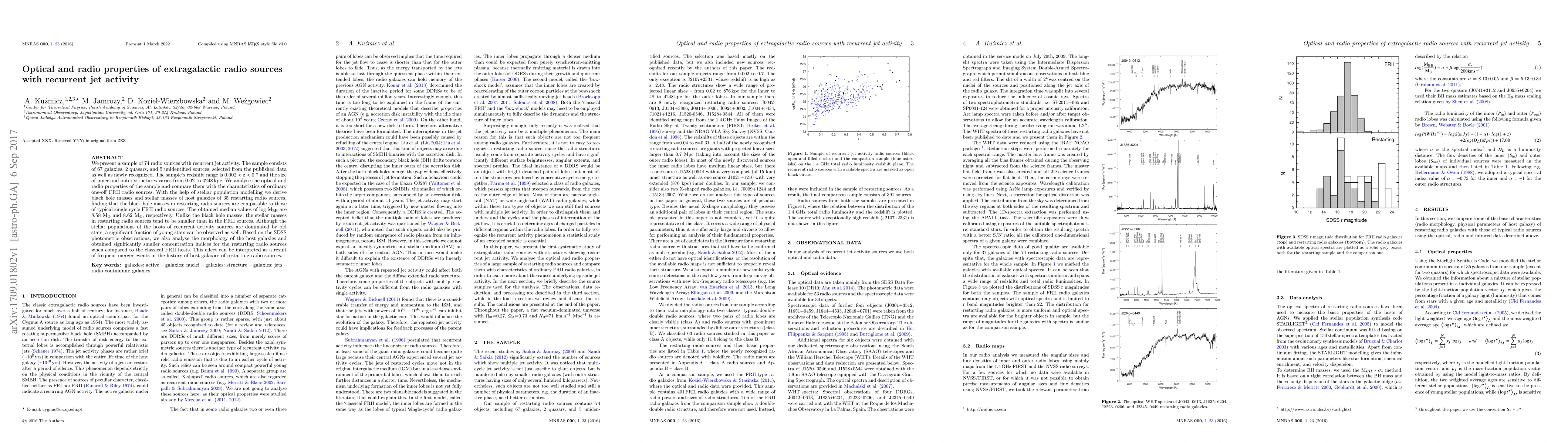We present a sample of 74 radio sources with recurrent jet activity. The sample consists of 67 galaxies, 2 quasars and 5 unidentified sources, selected from the published data or are newly recognized. The sample's redshift range is 0.002 < z < 0.7 and the size of inner and outer structures varies from 0.02 to 4248 kpc. We analyse the optical and radio properties of the sample and compare them with the characteristics of ordinary one-off FRII radio sources. With the help of stellar population modelling, we derive black hole masses and stellar masses of host galaxies of 35 restarting radio sources, finding that the black hole masses in restarting radio sources are comparable to those of typical single-cycle FRII radio sources. The obtained median values of log M$_{BH}$ are 8.58 and 8.62 M$_{\odot}$ Unlike the black hole masses, the stellar masses in restarting radio sources tend to be smaller than in the FRII sources. Although the stellar populations of the hosts of recurrent activity sources are dominated by old stars, a significant fraction of young stars can be observed as well. Based on the Sloan Digital Sky Survey photometric observations, we also analyse the morphology of the host galaxies and obtained significantly smaller concentration indices for the restarting radio sources when compared to the classical FRII hosts. This effect can be interpreted as a result of frequent merger events in the history of host galaxies of restarting radio sources.