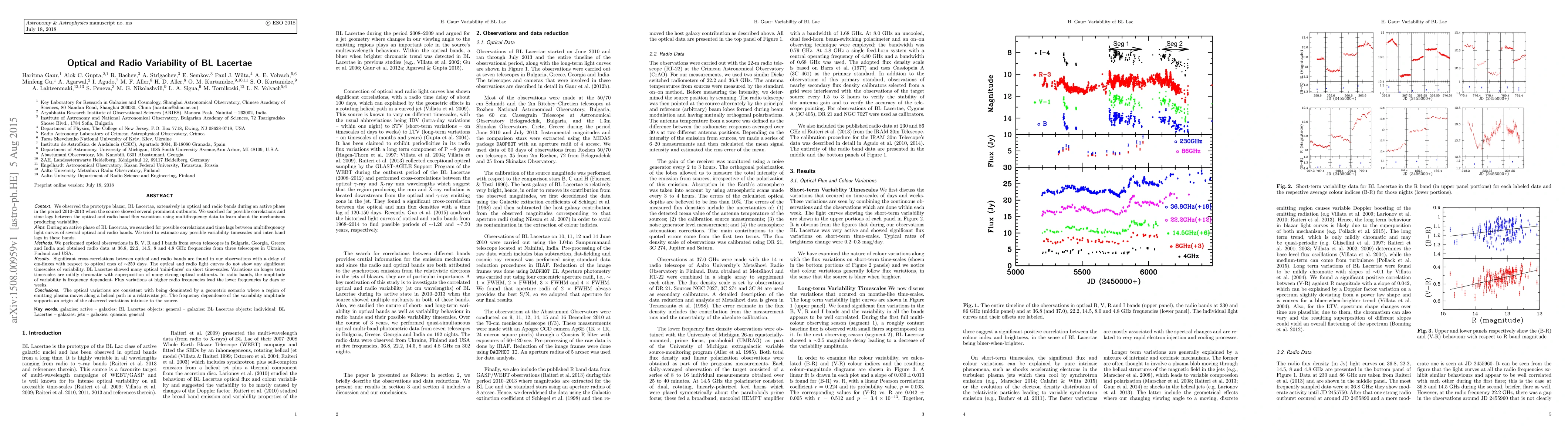 This study extensively observed BL Lacertae in optical and radio bands during an active phase from 2010-2013, finding significant cross-correlations between optical and radio flux variations with a ~250-day delay. The optical light curves exhibited short-term 'mini-flares' while radio variations showed frequency-dependent amplitude, suggesting intrinsic variability mechanisms.