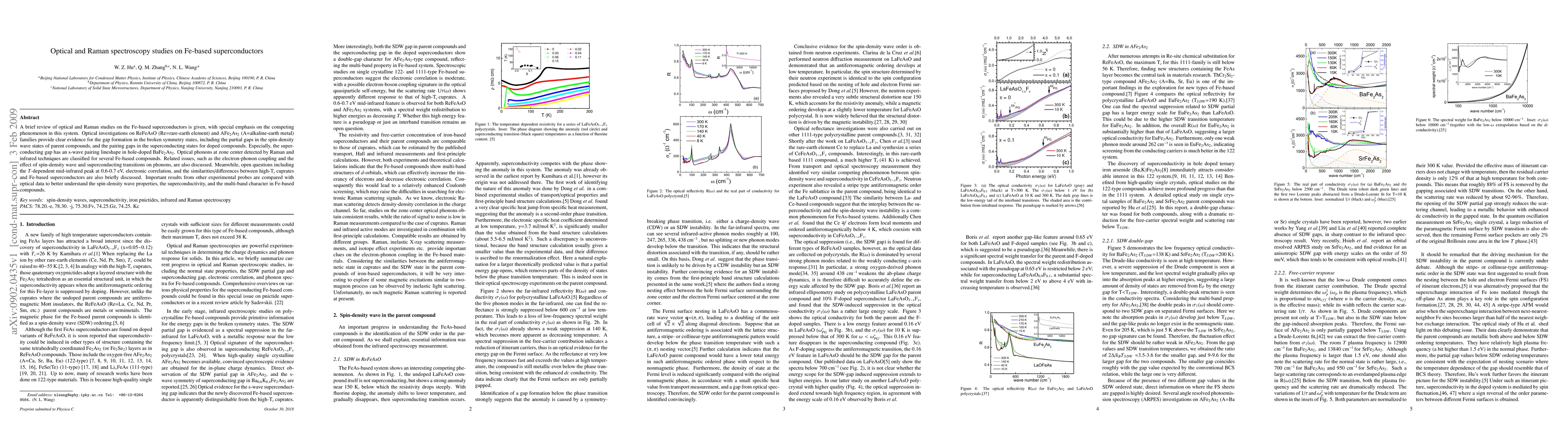 A brief review of optical and Raman studies on the Fe-based superconductors is given, with special emphasis on the competing phenomenon in this system. Optical investigations on ReFeAsO (Re=rare-earth element) and AFe$_2$As$_2$ (A=alkaline-earth metal) families provide clear evidence for the gap formation in the broken symmetry states, including the partial gaps in the spin-density wave states of parent compounds, and the pairing gaps in the superconducting states for doped compounds. Especially, the superconducting gap has an s-wave pairing lineshape in hole-doped BaFe$_2$As$_2$. Optical phonons at zone center detected by Raman and infrared techniques are classified for several Fe-based compounds. Related issues, such as the electron-phonon coupling and the effect of spin-density wave and superconducting transitions on phonons, are also discussed. Meanwhile, open questions including the \emph{T}-dependent mid-infrared peak at 0.6-0.7 eV, electronic correlation, and the similarities/differences between high-\Tc cuprates and Fe-based superconductors are also briefly discussed. Important results from other experimental probes are compared with optical data to better understand the spin-density wave properties, the superconductivity, and the multi-band character in Fe-based compounds.