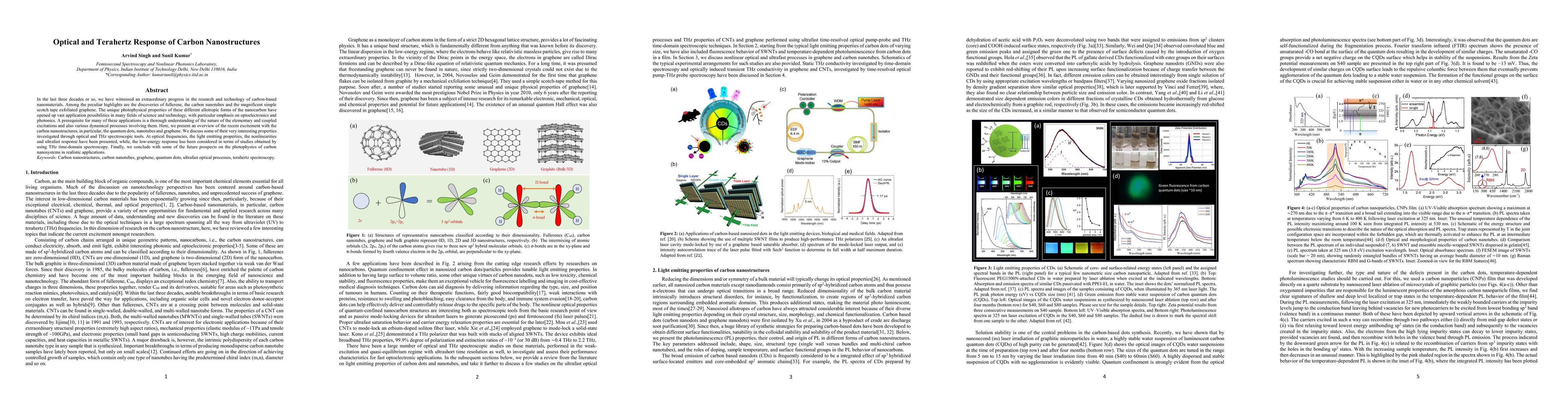 In the last three decades or so, we have witnessed an extraordinary progress in the research and technology of carbon-based nanomaterials. Among the peculiar highlights are the discoveries of fullerene, the carbon nanotubes and the magnificent simple scotch tape exfoliated graphene. The unique photophysical properties of these different allotropic forms of the nanocarbon have opened up vast application possibilities in many fields of science and technology, with particular emphasis on optoelectronics and photonics. A prerequisite for many of these applications is a thorough understanding of the nature of the elementary and coupled excitations and also various dynamical processes involving them. Here, we present an overview of the recent excitement with the carbon nanostructures, in particular, the quantum dots, nanotubes and graphene. We discuss some of their very interesting properties investigated through optical and THz spectroscopic tools. At optical frequencies, the light emitting properties, the nonlinearities and ultrafast response have been presented, while, the low-energy response has been considered in terms of studies obtained by using THz time-domain spectroscopy. Finally, we conclude with some of the future prospects on the photophysics of carbon nanosystems in realistic applications.