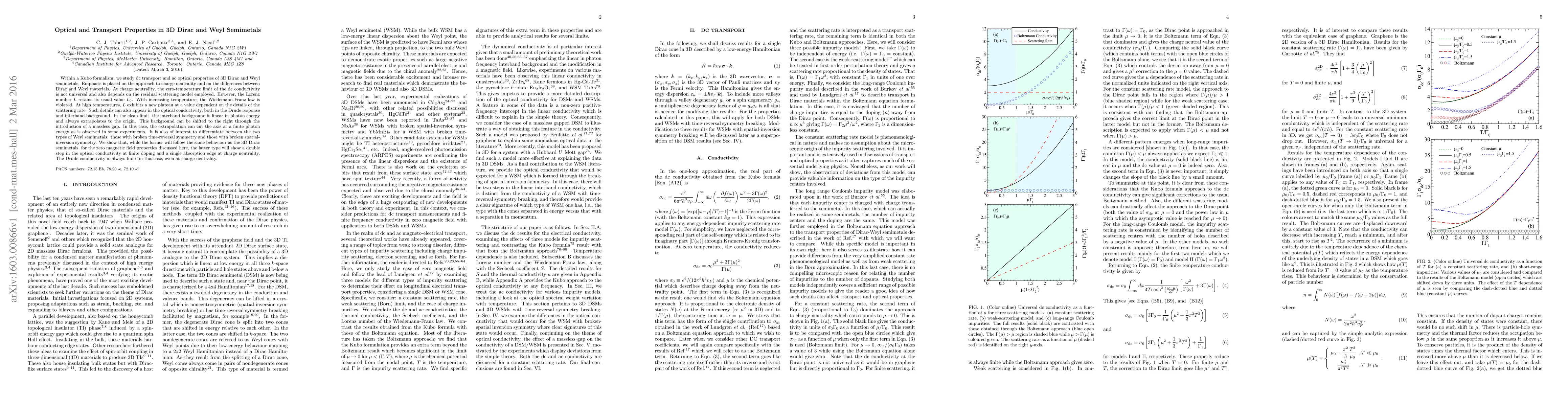 Within a Kubo formalism, we study dc transport and ac optical properties of 3D Dirac and Weyl semimetals. Emphasis is placed on the approach to charge neutrality and on the differences between Dirac and Weyl materials. At charge neutrality, the zero-temperature limit of the dc conductivity is not universal and also depends on the residual scattering model employed. However, the Lorenz number L retains its usual value L_0. With increasing temperature, the Wiedemann-Franz law is violated. At high temperatures, L exhibits a new plateau at a value dependent on the details of the scattering rate. Such details can also appear in the optical conductivity, both in the Drude response and interband background. In the clean limit, the interband background is linear in photon energy and always extrapolates to the origin. This background can be shifted to the right through the introduction of a massless gap. In this case, the extrapolation can cut the axis at a finite photon energy as is observed in some experiments. It is also of interest to differentiate between the two types of Weyl semimetals: those with broken time-reversal symmetry and those with broken spatial-inversion symmetry. We show that, while the former will follow the same behaviour as the 3D Dirac semimetals, for the zero magnetic field properties discussed here, the latter type will show a double step in the optical conductivity at finite doping and a single absorption edge at charge neutrality. The Drude conductivity is always finite in this case, even at charge neutrality.