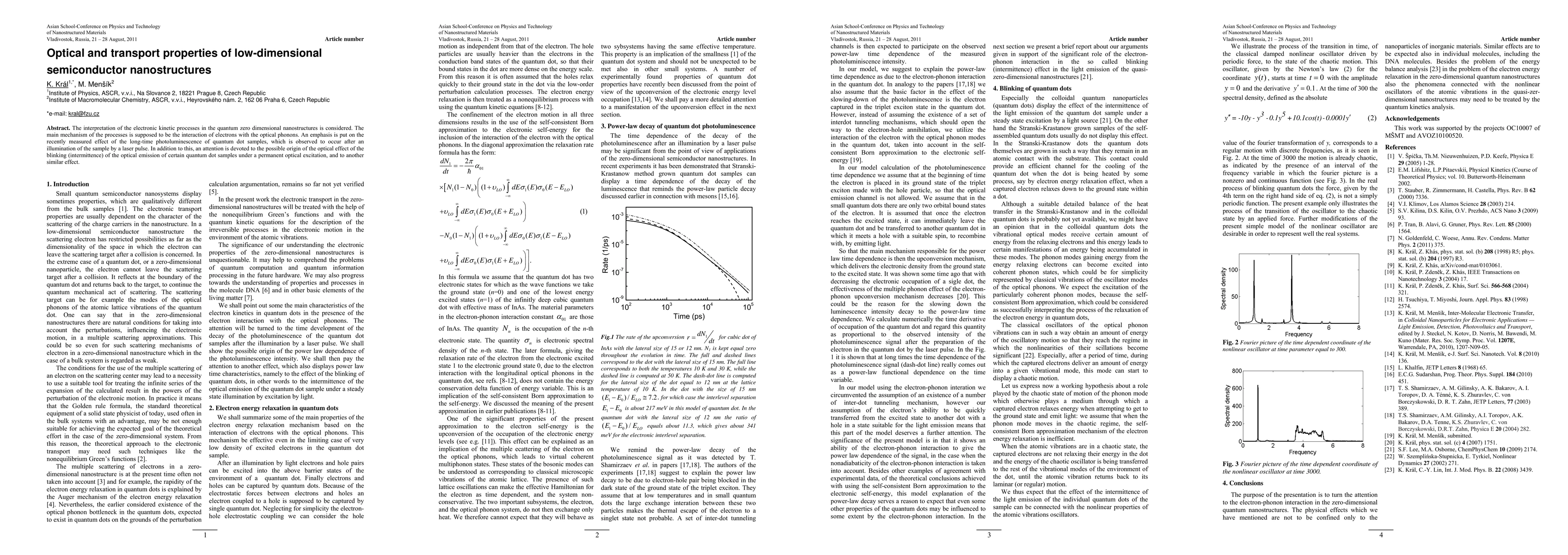The interpretation of the electronic kinetic processes in the quantum zero dimensional nanostructures is considered. The main mechanism of the processes is supposed to be the interaction of electrons with the optical phonons. An emphasis is put on the recently measured effect of the long-time photoluminescence of quantum dot samples, which is observed to occur after an illumination of the sample by a laser pulse. In addition to this, an attention is devoted to the possible origin of the optical effect of the blinking (intermittence) of the optical emission of certain quantum dot samples under a permanent optical excitation, and to another similar effect.