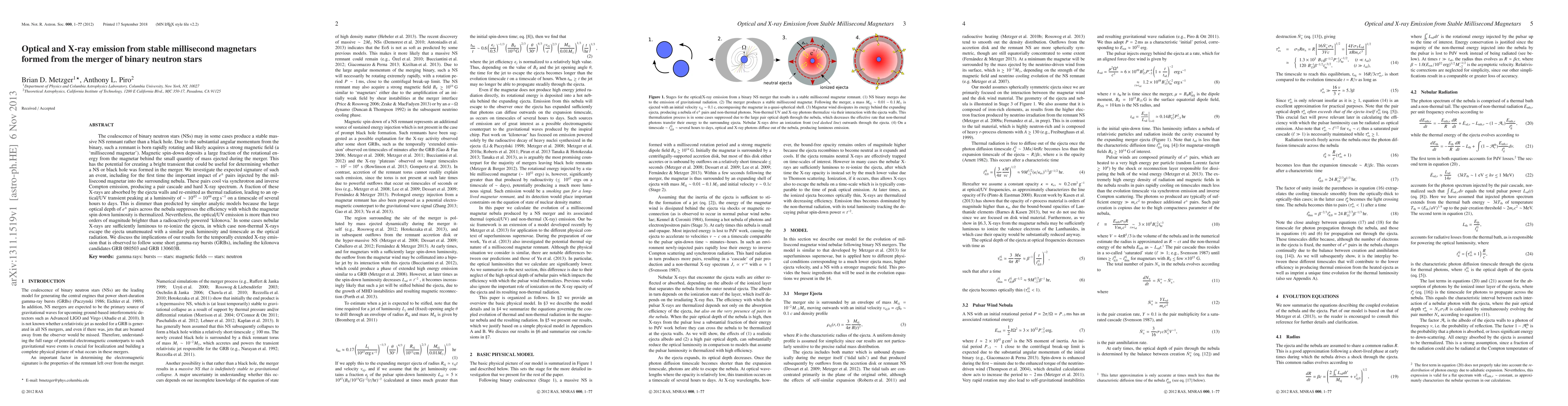 The coalescence of binary neutron stars (NSs) may in some cases produce a stable massive NS remnant rather than a black hole. Due to the substantial angular momentum from the binary, such a remnant is born rapidly rotating and likely acquires a strong magnetic field (a `millisecond magnetar'). Magnetic spin-down deposits a large fraction of the rotational energy from the magnetar behind the small quantity of mass ejected during the merger. This has the potential for creating a bright transient that could be useful for determining whether a NS or black hole was formed in the merger. We investigate the expected signature of such an event, including for the first time the important impact of electron/positron pairs injected by the millisecond magnetar into the surrounding nebula. These pairs cool via synchrotron and inverse Compton emission, producing a pair cascade and hard X-ray spectrum. A fraction of these X-rays are absorbed by the ejecta walls and re-emitted as thermal radiation, leading to an optical/UV transient peaking at a luminosity of ~1e43-1e44 erg/s on a timescale of several hours to days. This is dimmer than predicted by simpler analytic models because the large optical depth of electron/positron pairs across the nebula suppresses the efficiency with which the magnetar spin down luminosity is thermalized. Nevertheless, the optical/UV emission is more than two orders of magnitude brighter than a radioactively powered `kilonova.' In some cases nebular X-rays are sufficiently luminous to re-ionize the ejecta, in which case non-thermal X-rays escape the ejecta unattenuated with a similar peak luminosity and timescale as the optical radiation. We discuss the implications of our results for the temporally extended X-ray emission that is observed to follow some short gamma-ray bursts (GRBs), including the kilonova candidates GRB 080503 and GRB 130603B.
