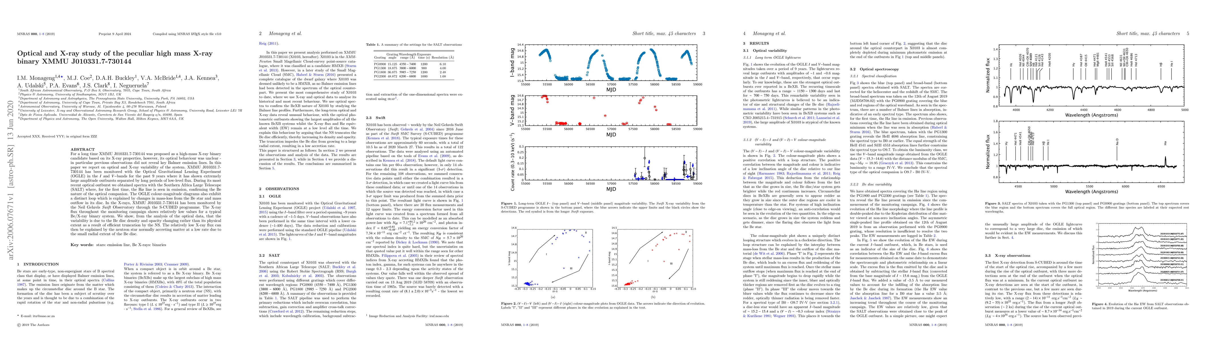 For a long time XMMU J010331.7-730144 was proposed as a high-mass X-ray binary candidate based on its X-ray properties, however, its optical behaviour was unclear - in particular previous observations did not reveal key Balmer emission lines. In this paper we report on optical and X-ray variability of the system. XMMU J010331.7-730144 has been monitored with the Optical Gravitational Lensing Experiment (OGLE) in the I and V-bands for the past 9 years where it has shown extremely large amplitude outbursts separated by long periods of low-level flux. During its most recent optical outburst we obtained spectra with the Southern Africa Large Telescope (SALT) where, for the first time, the H-alpha line is seen in emission, confirming the Be nature of the optical companion. The OGLE colour-magnitude diagrams also exhibit a distinct loop which is explained by changes in mass-loss from the Be star and mass outflow in its disc. In the X-rays, XMMU J010331.7-730144 has been monitored by the Neil Gehrels Swift Observatory through the S-CUBED programme. The X-ray flux throughout the monitoring campaign shows relatively low values for a typical Be/X-ray binary system. We show, from the analysis of the optical data, that the variability is due to the Be disc density and opacity changing rather than its physical extent as a result of efficient truncation by the NS. The relatively low X-ray flux can then be explained by the neutron star normally accreting matter at a low rate due to the small radial extent of the Be disc.