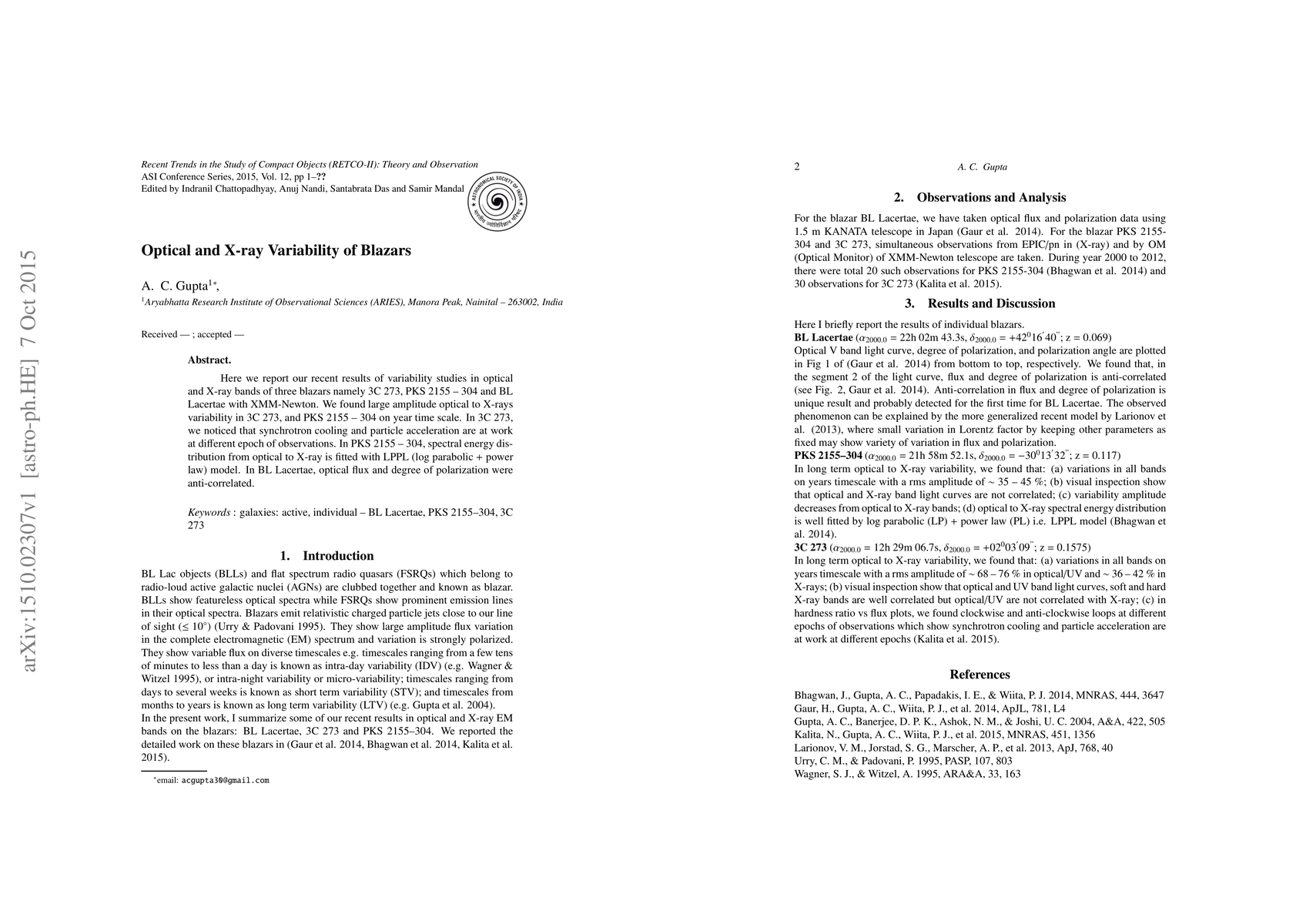 Here we report our recent results of variability studies in optical and X-ray bands of three blazars namely 3C 273, PKS 2155 - 304 and BL Lacertae with XMM-Newton. We found large amplitude optical to X-rays variability in 3C 273, and PKS 2155 - 304 on year time scale. In 3C 273, we noticed that synchrotron cooling and particle acceleration are at work at different epoch of observations. In PKS 2155 - 304, spectral energy distribution from optical to X-ray is fitted with LPPL (log parabolic + power law) model. In BL Lacertae, optical flux and degree of polarization were anti-correlated.