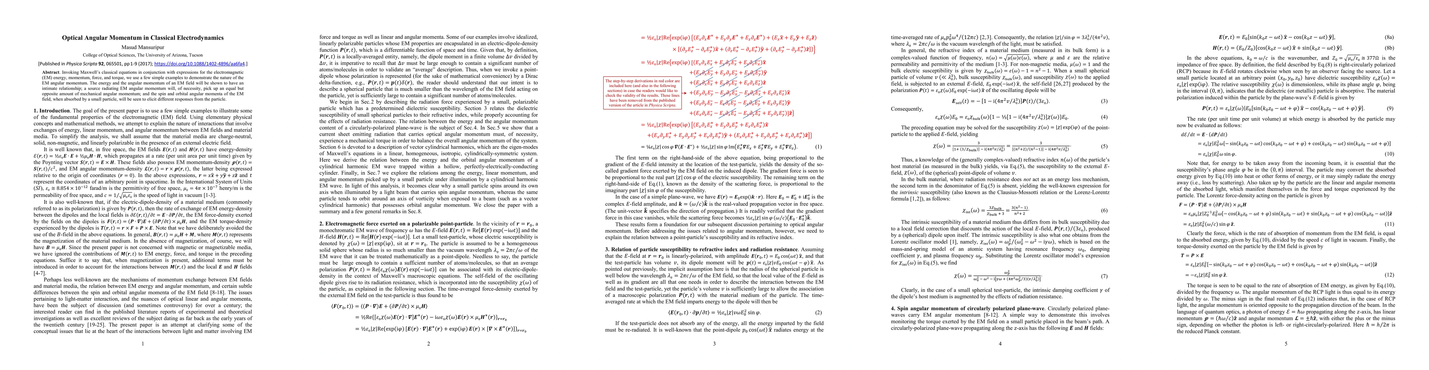 This paper explores the classical electrodynamics of optical angular momentum, demonstrating how electromagnetic fields carry angular momentum and how this relates to the conservation of angular momentum in radiating systems. It highlights the distinct effects of spin and orbital angular momentum on particles absorbing the electromagnetic field.