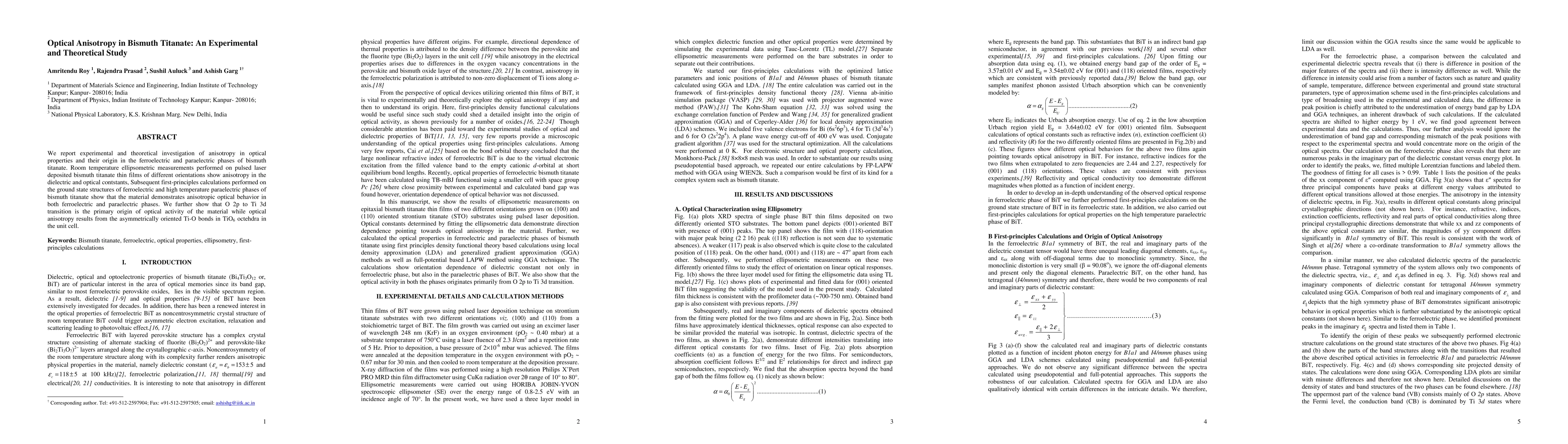 This study investigates optical anisotropy in bismuth titanate through experimental ellipsometry and theoretical calculations, revealing anisotropic optical behavior in both ferroelectric and paraelectric phases, primarily due to the O 2p to Ti 3d transition and asymmetrically oriented Ti-O bonds in the unit cell.