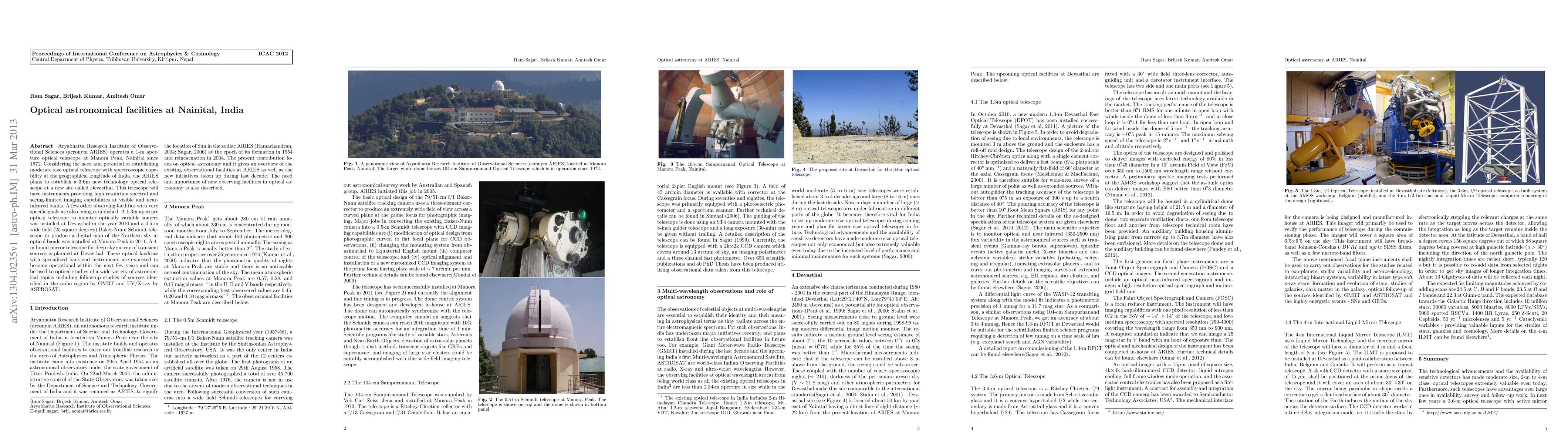 Aryabhatta Research Institute of Observational Sciences (acronym ARIES) operates a 1-m aperture optical telescope at Manora Peak, Nainital since 1972. Considering the need and potential of establishing moderate size optical telescope with spectroscopic capability at the geographical longitude of India, the ARIES plans to establish a 3.6m new technology optical telescope at a new site called Devasthal. This telescope will have instruments providing high resolution spectral and seeing-limited imaging capabilities at visible and near-infrared bands. A few other observing facilities with very specific goals are also being established. A 1.3m aperture optical telescope to monitor optically variable sources was installed at Devasthal in the year 2010 and a 0.5-m wide field (25 square degrees) Baker-Nunn Schmidt telescope to produce a digital map of the Northern sky at optical bands was installed at Manora Peak in 2011. A 4-m liquid mirror telescope for deep sky survey of transient sources is planned at Devasthal. These optical facilities with specialized back-end instruments are expected to become operational within the next few years and can be used to optical studies of a wide variety of astronomical topics including follow-up studies of sources identified in the radio region by GMRT and UV/X-ray by ASTROSAT.
