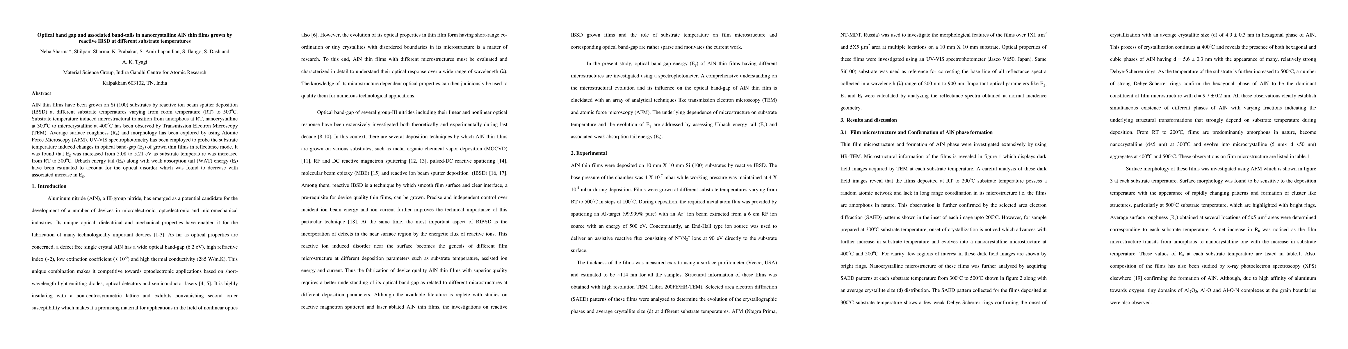 AlN thin films have been grown on Si (100) substrates by reactive ion beam sputter deposition (IBSD) at different substrate temperatures varying from room temperature (RT) to 500oC. Substrate temperature induced microstructural transition from amorphous at RT, nanocrystalline at 300oC to microcrystalline at 400oC has been observed by Transmission Electron Microscopy (TEM). Average surface roughness (Ra) and morphology has been explored by using Atomic Force Microscopy (AFM). UV-VIS spectrophotometry has been employed to probe the substrate temperature induced changes in optical band-gap (Eg) of grown thin films in reflectance mode. It was found that Eg was increased from 5.08 to 5.21 eV as substrate temperature was increased from RT to 500oC. Urbach energy tail (Eu) along with weak absorption tail (WAT) energy (Et) have been estimated to account for the optical disorder which was found to decrease with associated increase in Eg.