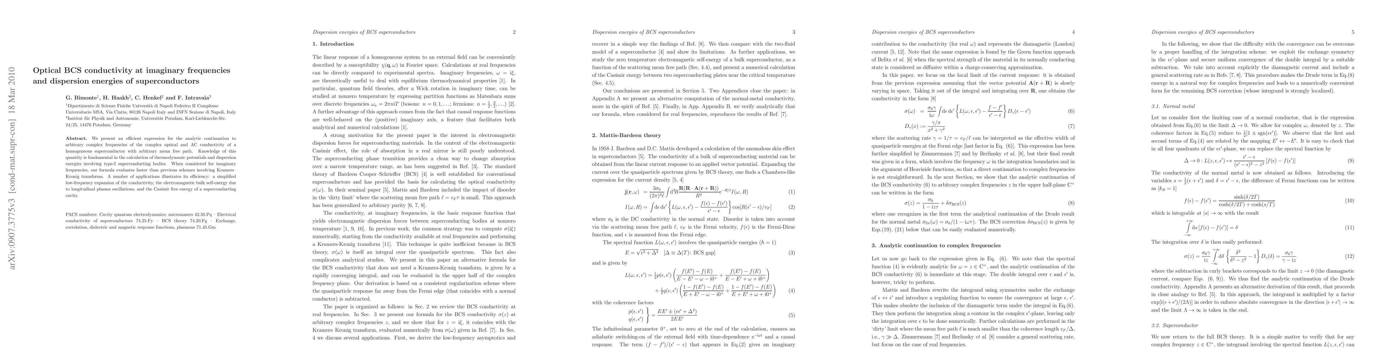 We present an efficient expression for the analytic continuation to arbitrary complex frequencies of the complex optical and AC conductivity of a homogeneous superconductor with arbitrary mean free path. Knowledge of this quantity is fundamental in the calculation of thermodynamic potentials and dispersion energies involving type-I superconducting bodies. When considered for imaginary frequencies, our formula evaluates faster than previous schemes involving Kramers--Kronig transforms. A number of applications illustrates its efficiency: a simplified low-frequency expansion of the conductivity, the electromagnetic bulk self-energy due to longitudinal plasma oscillations, and the Casimir free energy of a superconducting cavity.