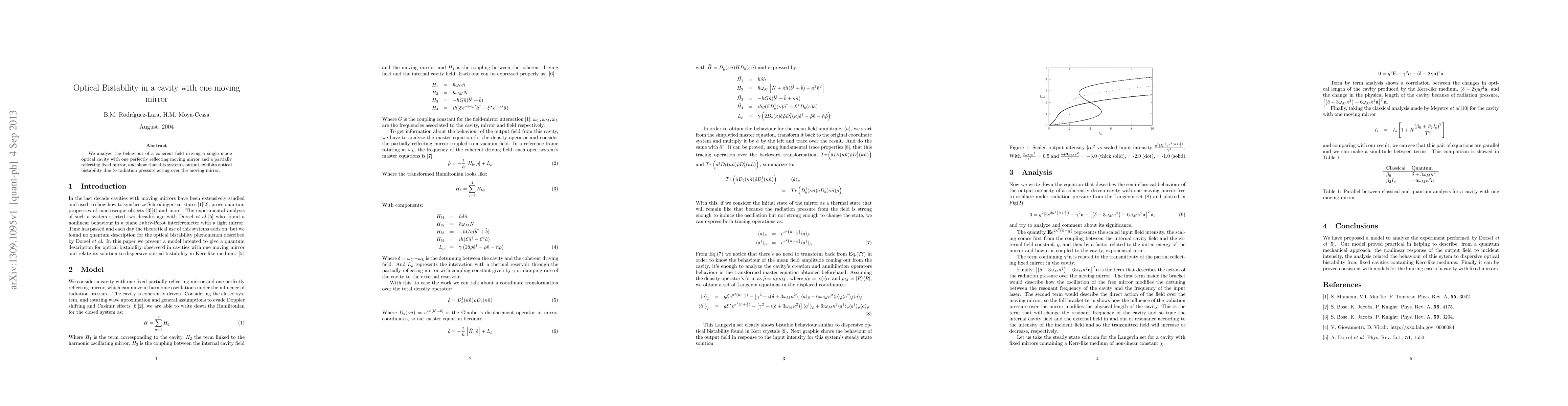 Summary: This study investigates an optical cavity with a moving mirror and a fixed mirror, driven by a coherent field, demonstrating optical bistability caused by radiation pressure on the moving mirror. The system's output behavior reveals distinct stable states under varying input intensities.