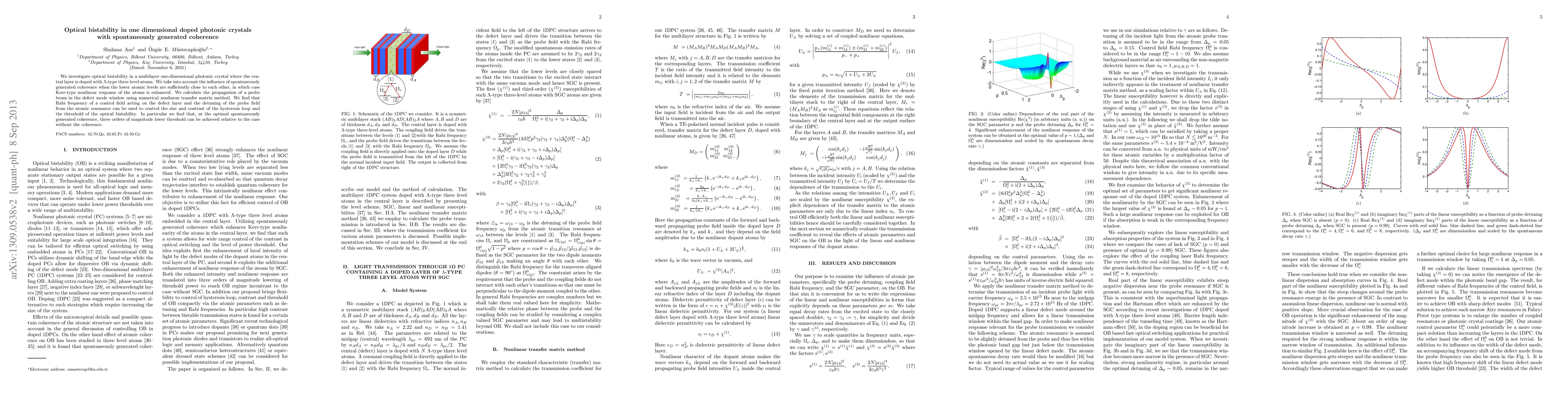 This paper explores optical bistability in a one-dimensional doped photonic crystal with $\Lambda$-type three-level atoms, emphasizing the role of spontaneously generated coherence. The study reveals that control over the Rabi frequency and probe field detuning can manipulate the hysteresis loop and optical bistability threshold, achieving significantly lower thresholds with optimal coherence.