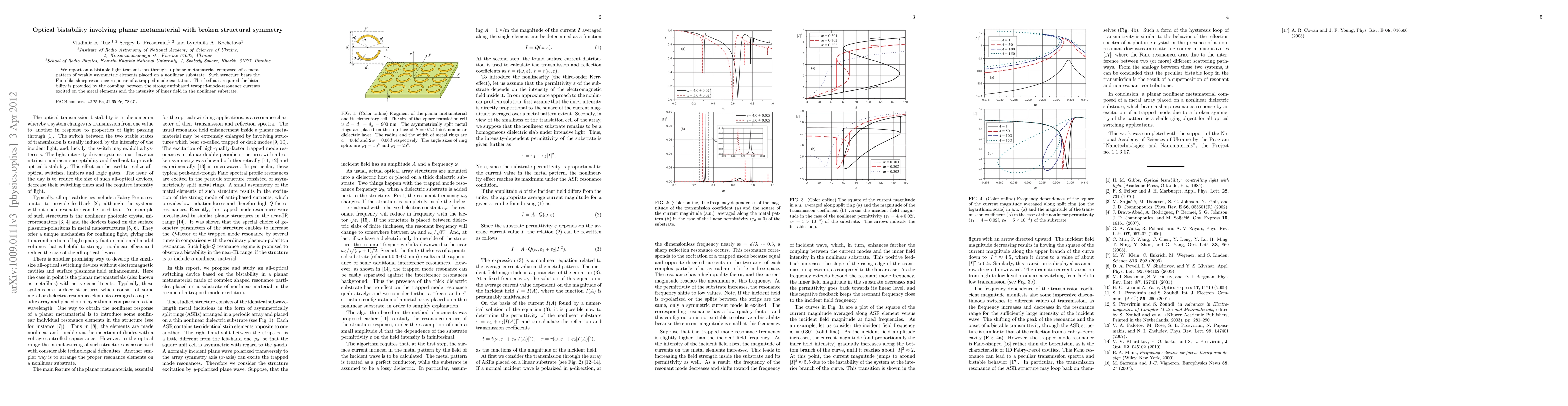 Researchers created a planar metamaterial that exhibits optical bistability when metal elements on a nonlinear substrate create strong antiphased resonance currents, leading to feedback-controlled light transmission states.