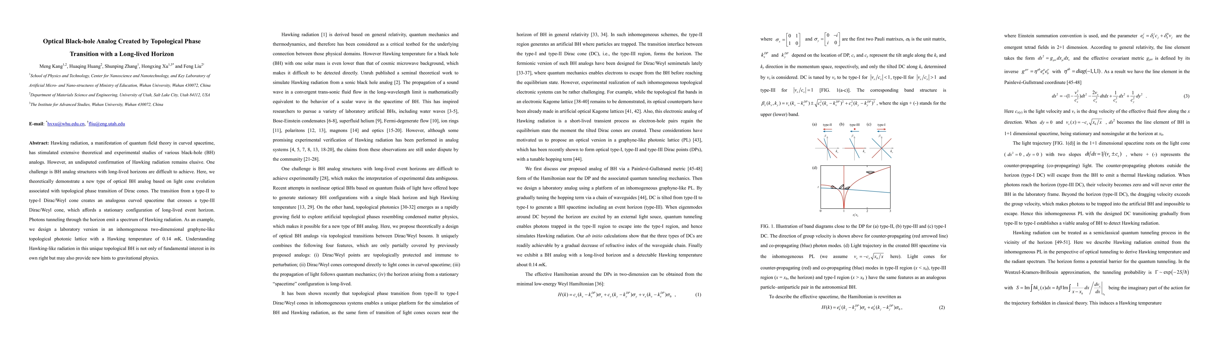 This paper proposes a novel optical black-hole analog created via a topological phase transition in a photonic lattice, featuring a long-lived event horizon. The study demonstrates the emission of Hawking radiation through the horizon, potentially offering insights into gravitational physics.