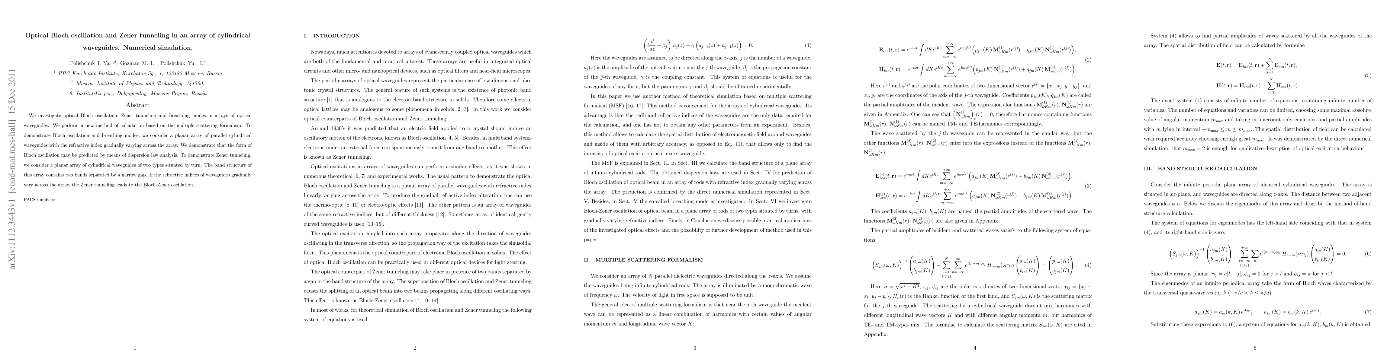 This paper explores optical Bloch oscillation and Zener tunneling in arrays of cylindrical waveguides using a numerical simulation based on multiple scattering. It demonstrates Bloch oscillation through dispersion law analysis and shows Zener tunneling leading to Bloch-Zener oscillation in arrays with alternating waveguide types and varying refractive indices.