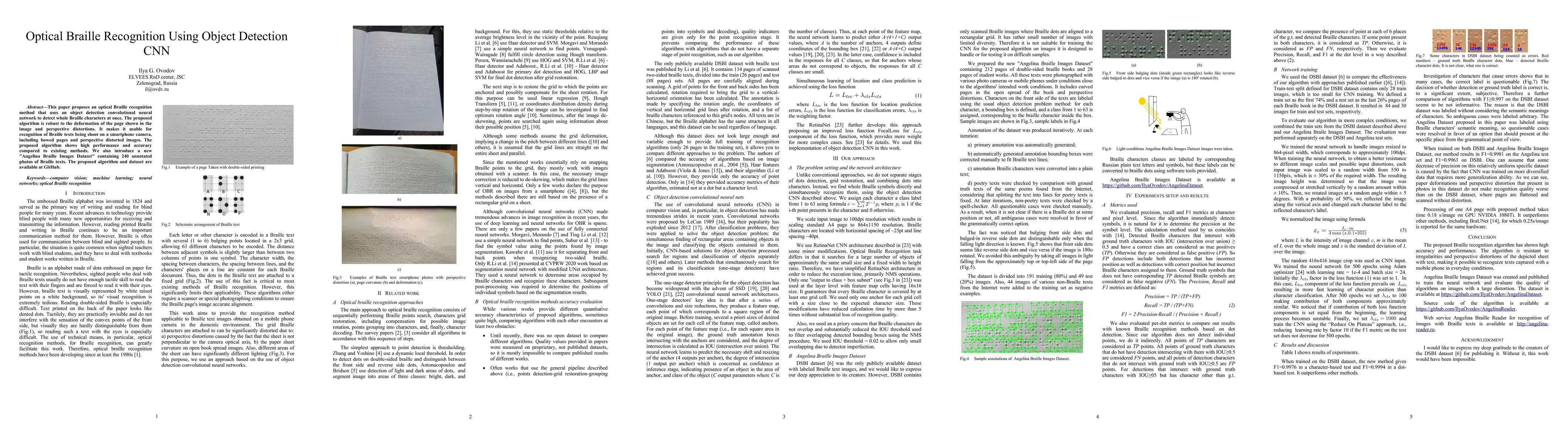This paper presents an optical Braille recognition method using an object detection CNN that can accurately identify whole Braille characters despite page deformations and perspective distortions. The new "Angelina Braille Images Dataset" with 240 annotated photos supports the proposed algorithm, which demonstrates superior performance compared to existing methods.