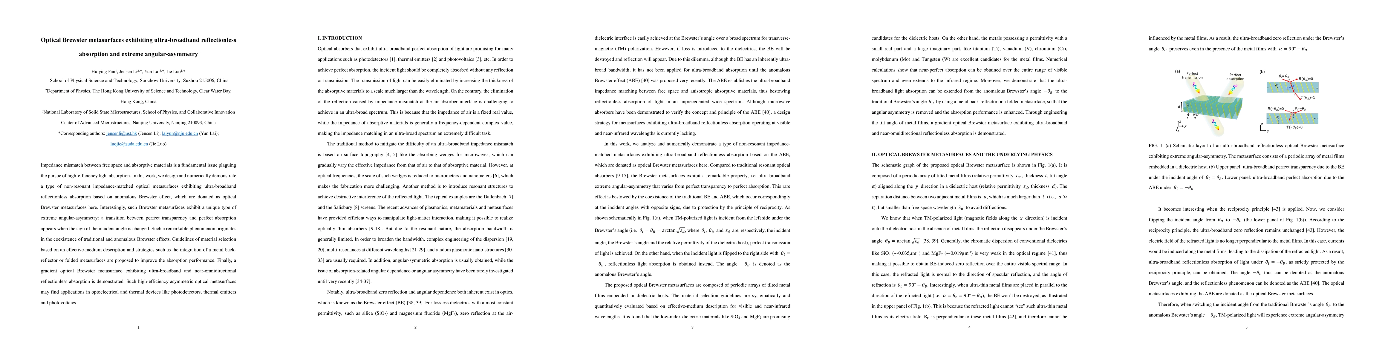 This paper designs ultra-broadband optical metasurfaces based on the anomalous Brewster effect, achieving reflectionless absorption and extreme angular-asymmetry. The proposed metasurfaces show potential for applications in optoelectrical and thermal devices.