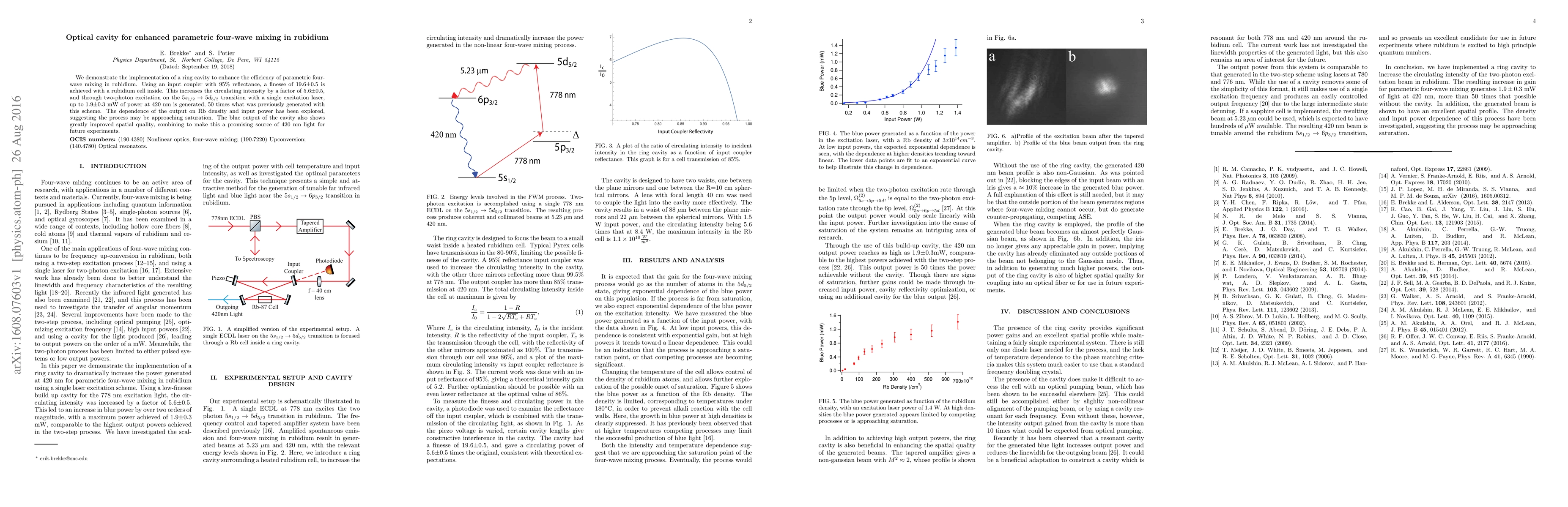 This study demonstrates a ring optical cavity enhancing parametric four-wave mixing in rubidium, achieving a 5.6-fold increase in circulating intensity and generating up to 1.9 mW of blue light at 420 nm, significantly surpassing previous outputs. The improved spatial quality and saturation behavior suggest potential for future experiments.